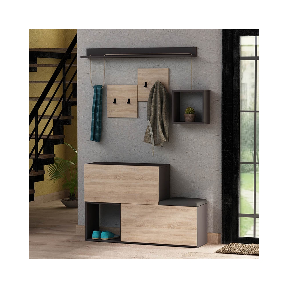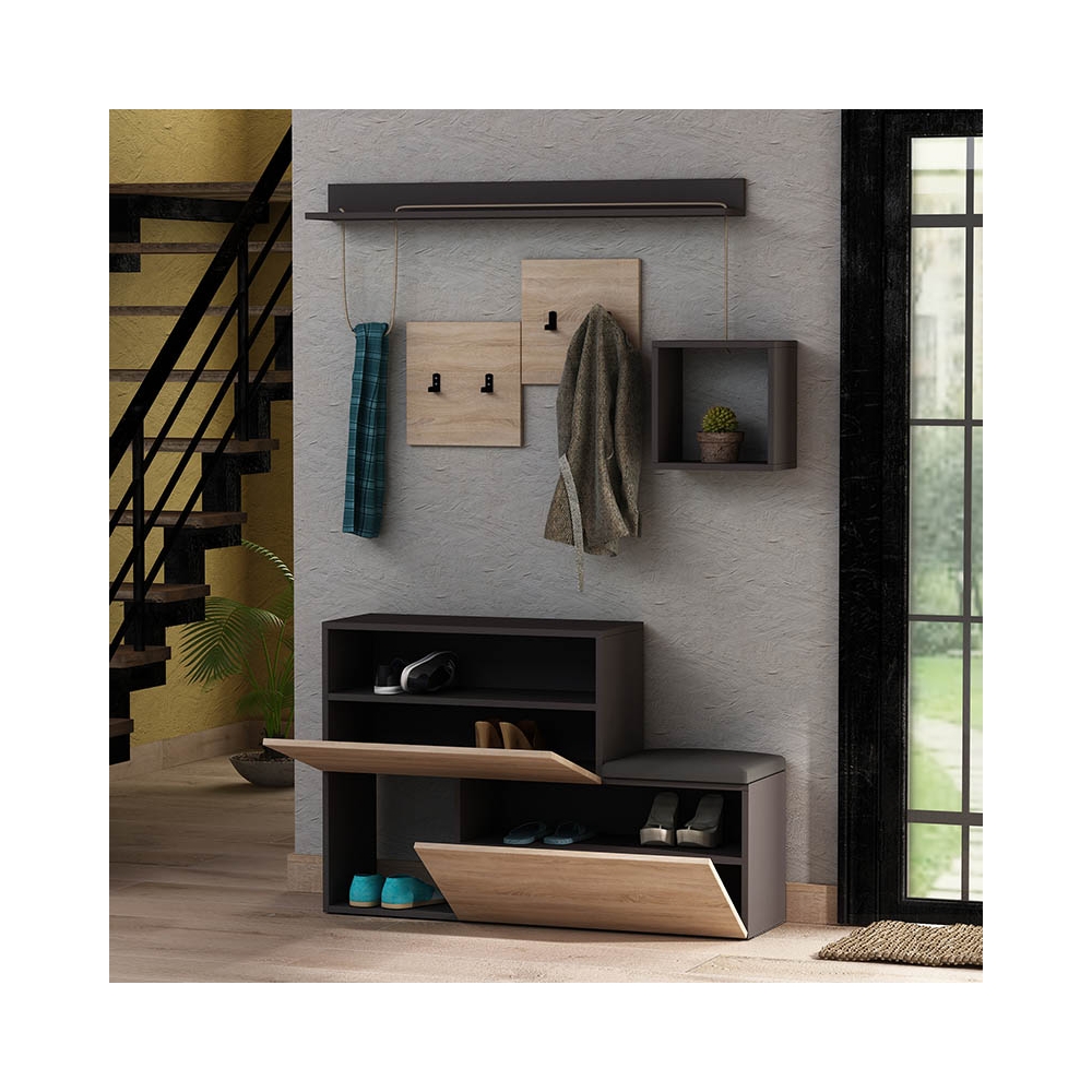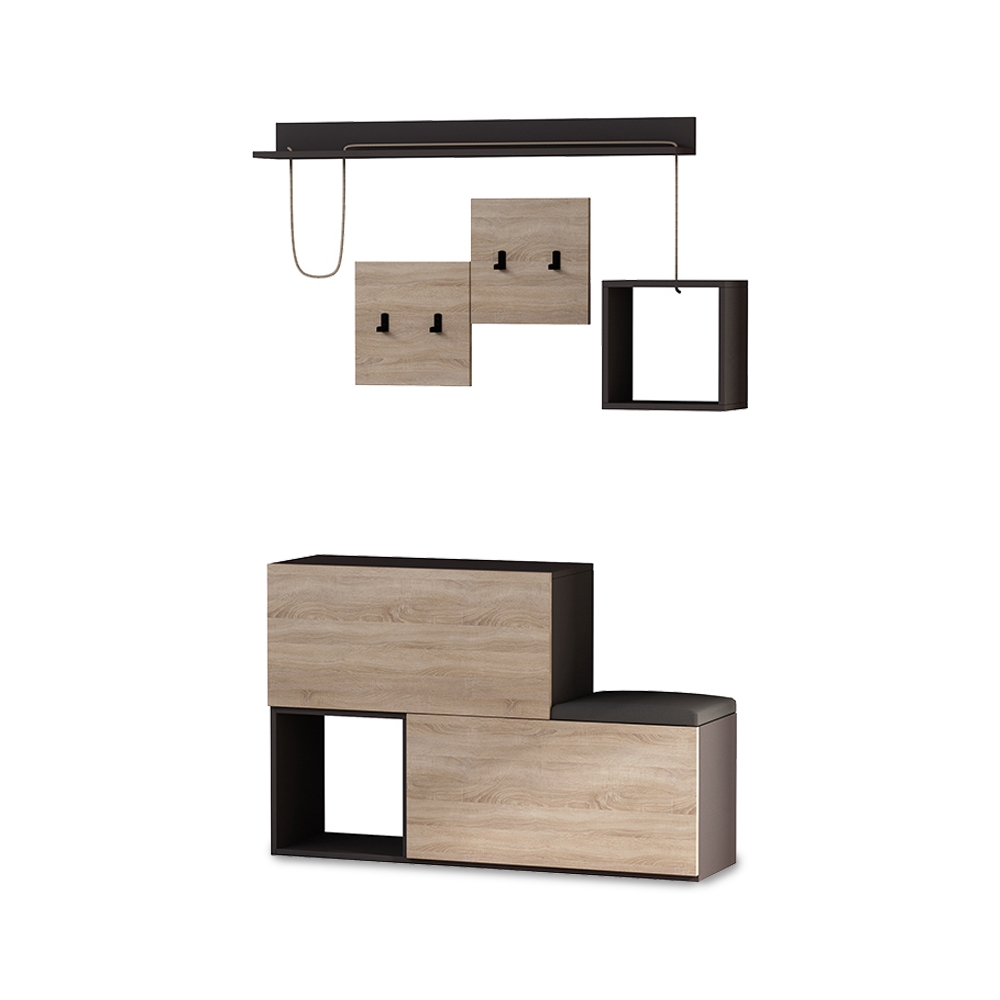 - Περιλαμβάνει δύο κλειστά ντουλάπια για παπούτσια, ράφια / κουτιά για διακοσμητικά, κρεμάστρες για ρούχα και ένα αναπαυτικό μαξιλάρι καθίσματος σε χρώμα μαύρο στην μία άκρη για χρήση ως σκαμπό.
