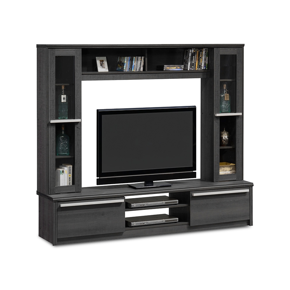 * Το κάτω μέρος της σύνθεσης φέρει δύο ντουλαπάκια και ράφια για την αποθήκευση των ηλεκτρονικών συσκευών. Δεξιά και αριστερά υπάρχει βιτρίνα με κρύσταλλο ενώ την σύνθεση δένει μία οριζόντια ραφιέρα για την προβολή των αγαπημένων σας αντικειμένων. * Δέχεται τηλεόραση 52'' - Με κενό εσωτερικό χώρο 120x95εκ ύψος. Διάσταση προϊόντος: