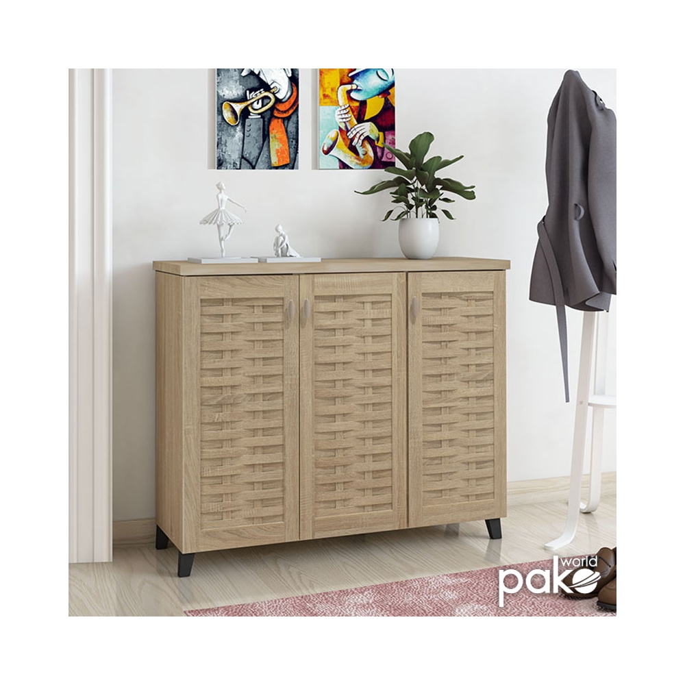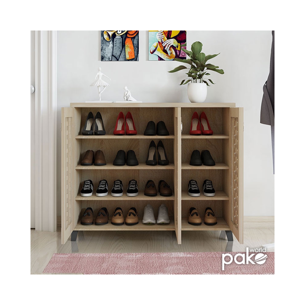 - Περιλαμβάνει τρεις πόρτες σε σχέδιο-μοτίβο πλέγματος, εσωτερικά φέρει έξι ράφια για 16 ζεύγη παπουτσιών, ρούχα ή αξεσουάρ.