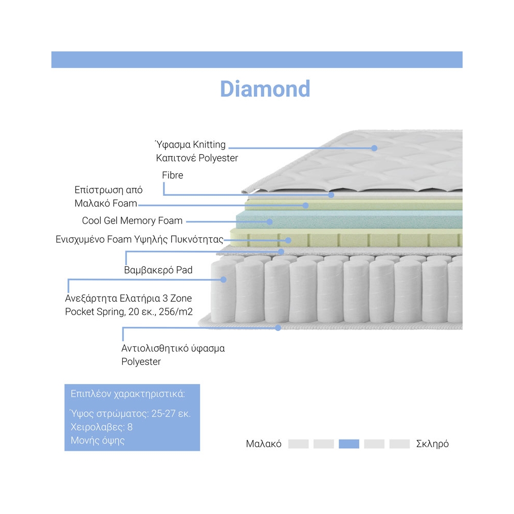 Για εσάς που ο υγιεινός ύπνος είναι η γλυκότερη απόλαυση της ζωής, η επιλογή του Diamond αποτελεί μία μυσταγωγία. Δεν πρόκειται για ένα ακόμα στρώμα, αλλά για το ιδανικό εργαλείο για να διατηρείστε σε φόρμα και γεμάτοι ενέργεια όλη τη μέρα. Το Diamod φέρει τρεις ζώνες ανεξάρτητων ελατηρίων, ενισχυμένες με επάλληλα στρώματα διαφορετικής πυκνότητα memory foam με στόχο την εκτόνωση της πίεσης και την ορθή ανατομία του ανθρώπινου σώματος.