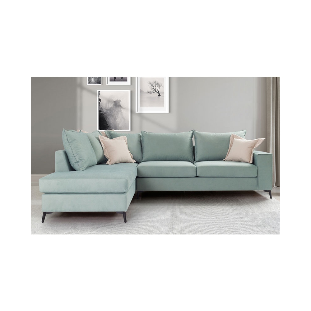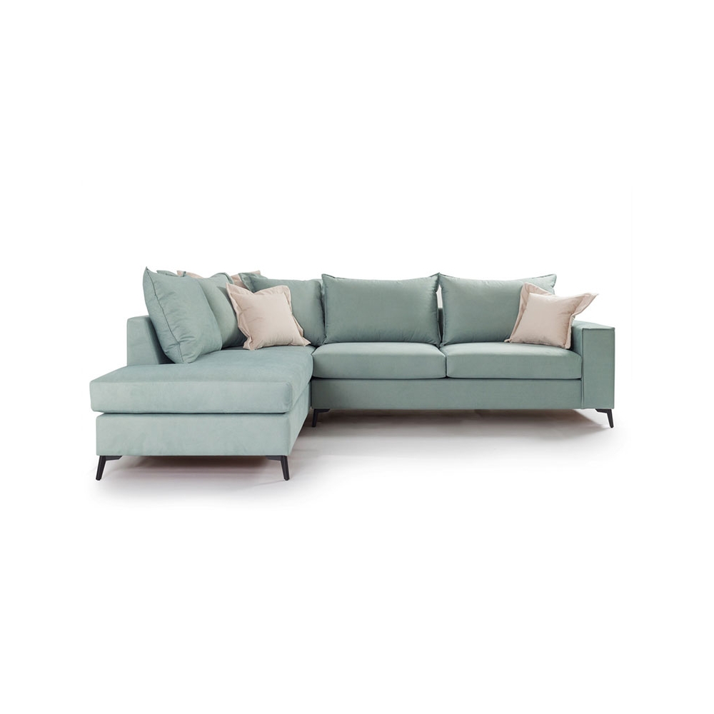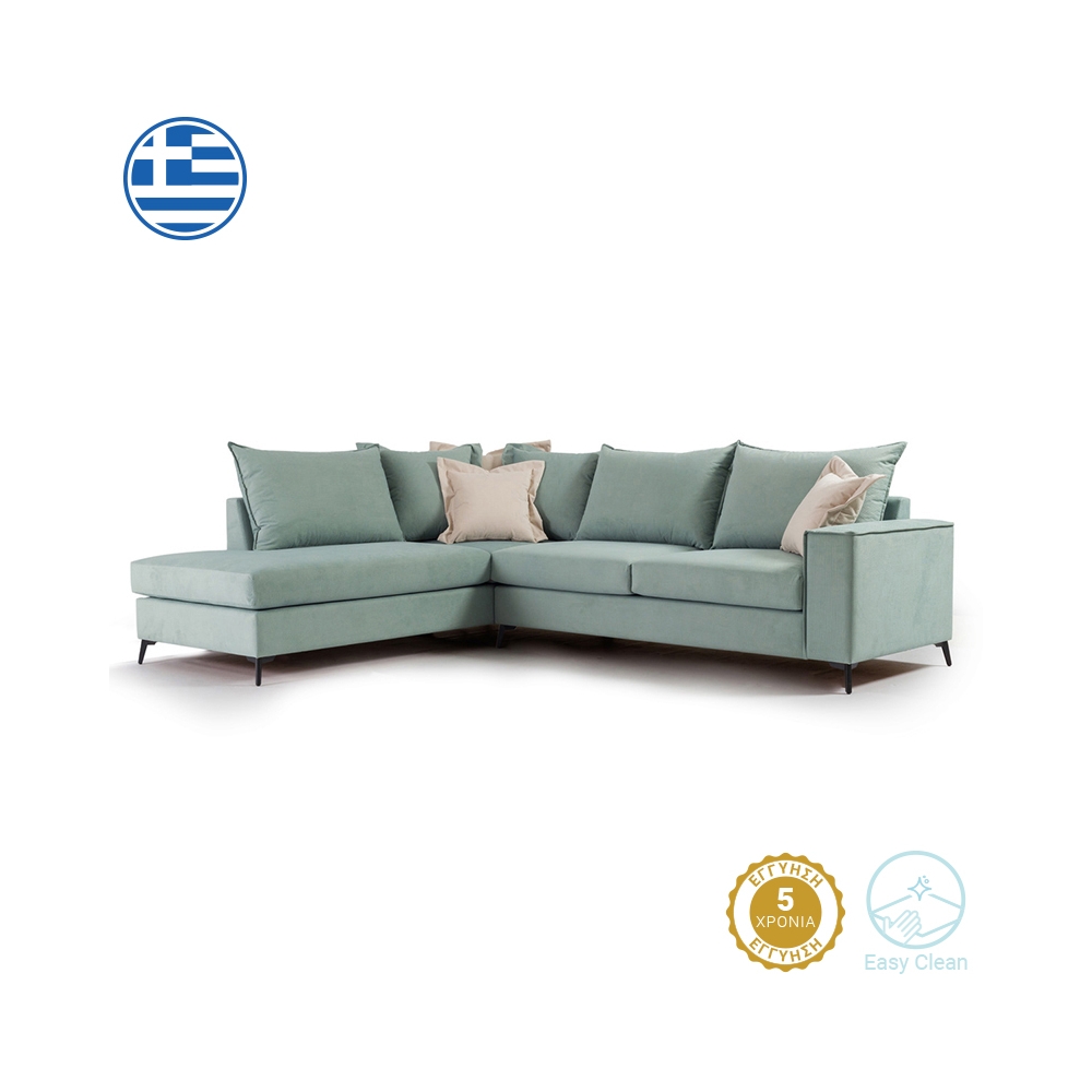 Τεχνικά χαρακτηριστικά: Κατασκευή από: - Σκελετό μοριοσανίδας, ξύλο λεύκας και επένδυση MDF + αφρολέξ - Μαξιλάρι καθίσματος αφρολέξ 400άρι plus, με διπλή βάτα ενισχυμένη με ελαστικές ίνες και μαξιλάρι πλάτης από 100% καθαρή σιλικόνη. - Ποδαρικό από υψηλής ποιότητας μέταλλο σε μαύρο χρώμα. - Φέρει επένδυση υφάσματος Easy Clean (90% αδιάβροχο) εξαιρετικής ποιότητας και αντοχής. Όλα τα μαξιλάρια (πλάτης και έδρας) έχουν φερμουάρ και μπορούν να πληθούν στους 30 βαθμούς. -Χρώμα καναπέ και μαξιλαριών πλάτης: Ciel - Φέρει δύο διακοσμητικά μαξιλαράκια σε Cream χρώμα.