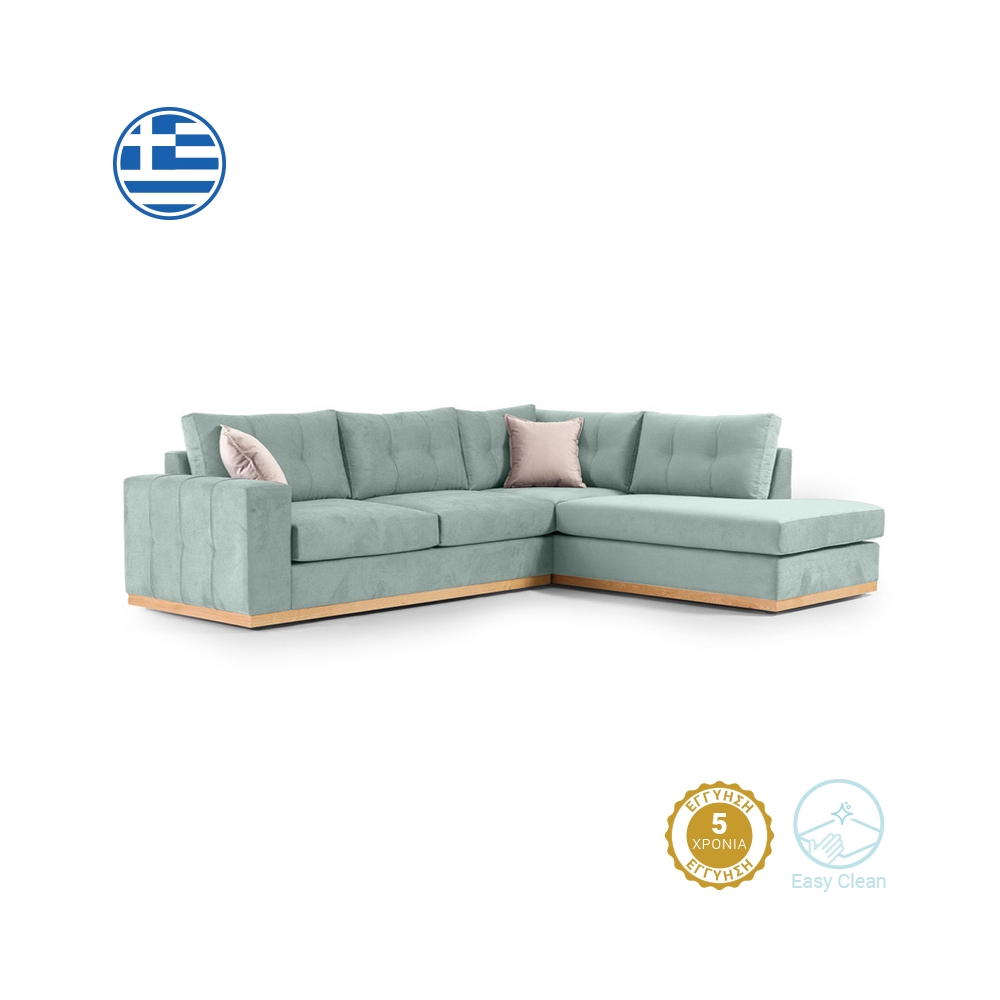 Τεχνικά χαρακτηριστικά: - Σκελετός μοριοσανίδας, ξύλο λεύκας και επένδυση MDF + αφρολέξ - Στήριξη σε μαύρο χαμηλό πόδι πολυπροπυλενίου, υψηλής αντοχής. - Μαξιλάρι καθίσματος αφρολέξ 400άρι plus, με διπλή βάτα ενισχυμένη με ελαστικές ίνες και μαξιλάρι πλάτης από 100% καθαρή σιλικόνη. - Φέρει επένδυση υφάσματος Easy Clean (90% αδιάβροχο) εξαιρετικής ποιότητας και αντοχής. Όλα τα μαξιλάρια (πλάτης και έδρας) έχουν φερμουάρ και μπορούν να πλυθούν στους 30 βαθμούς. -Χρώμα καναπέ και μαξιλαριών πλάτης: Ciel - Φέρει δύο διακοσμητικά μαξιλαράκια σε Cream χρώμα. -Περιμετρικά στη βάση φέρει επένδυση από ξύλο λεύκας σε φυσικό χρώμα.