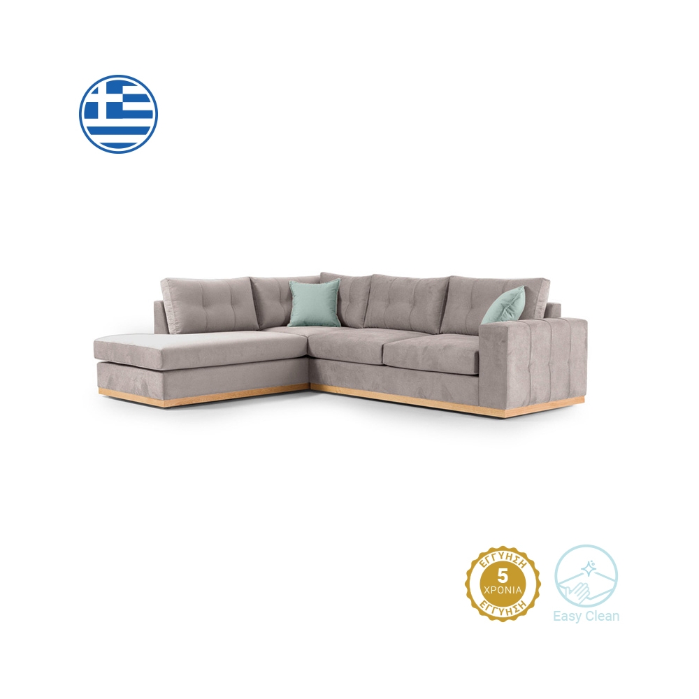 Τεχνικά χαρακτηριστικά: - Σκελετός μοριοσανίδας, ξύλο λεύκας και επένδυση MDF + αφρολέξ - Στήριξη σε μαύρο χαμηλό πόδι πολυπροπυλενίου, υψηλής αντοχής. - Μαξιλάρι καθίσματος αφρολέξ 400άρι plus, με διπλή βάτα ενισχυμένη με ελαστικές ίνες και μαξιλάρι πλάτης από 100% καθαρή σιλικόνη. - Φέρει επένδυση υφάσματος Easy Clean (90% αδιάβροχο) εξαιρετικής ποιότητας και αντοχής. Όλα τα μαξιλάρια (πλάτης και έδρας) έχουν φερμουάρ και μπορούν να πλυθούν στους 30 βαθμούς. -Χρώμα καναπέ και μαξιλαριών πλάτης: Elephant - Φέρει δύο διακοσμητικά μαξιλαράκια σε Ciel χρώμα. -Περιμετρικά στη βάση φέρει επένδυση από ξύλο λεύκας σε φυσικό χρώμα.