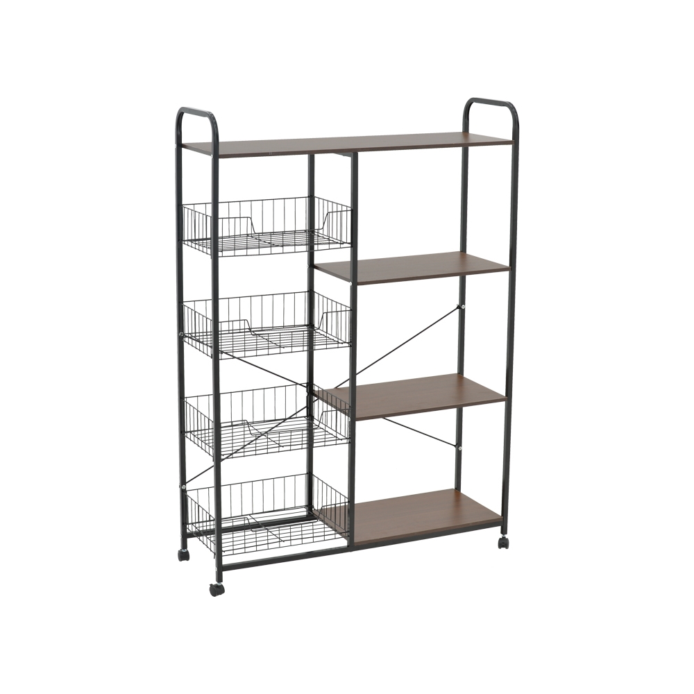 Τεχνικά χαρακτηριστικά: * Σκελετός από υψηλής ποιότητας μέταλλο με μεγάλη αντοχή στην καταπόνηση και στη φθορά. * Διαθέτει τέσσερα ράφια από MDF και τέσσερα μεταλλικά στην άλλη. * Φέρει τέσσερα μαύρα ροδάκια που διευκολύνουν τη μεταφορά της. * Διατίθεται στο χρωματισμό του καρυδί-μαύρου. * Σταθερός σκελετός : ιδανική και για χώρους που δημιουργείται υγρασία όπως η κουζίνα σας