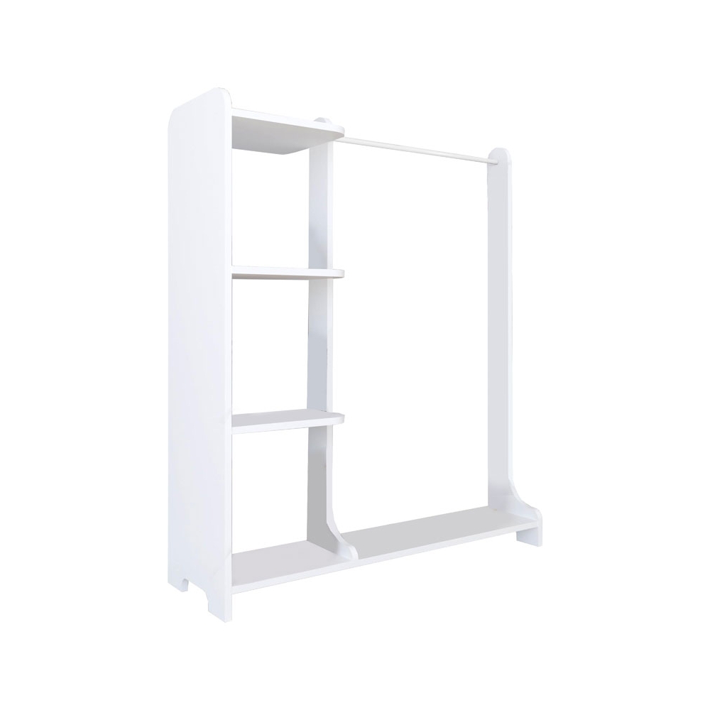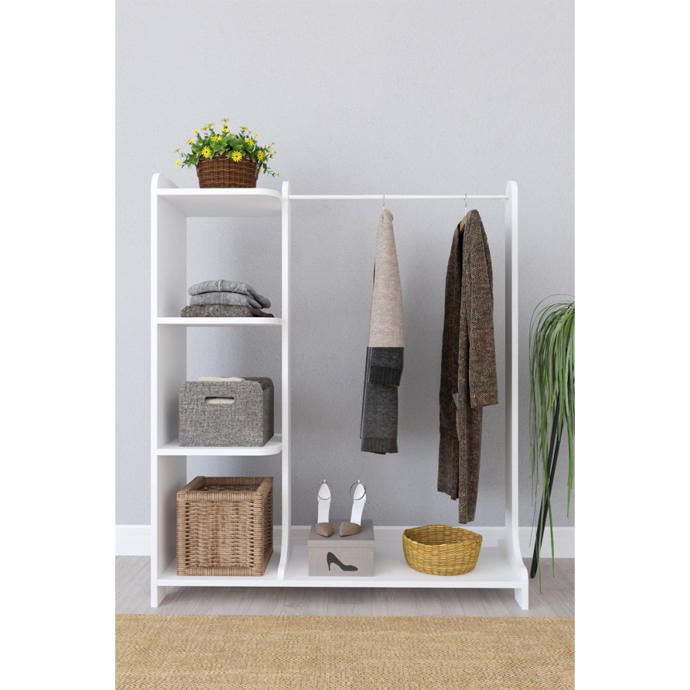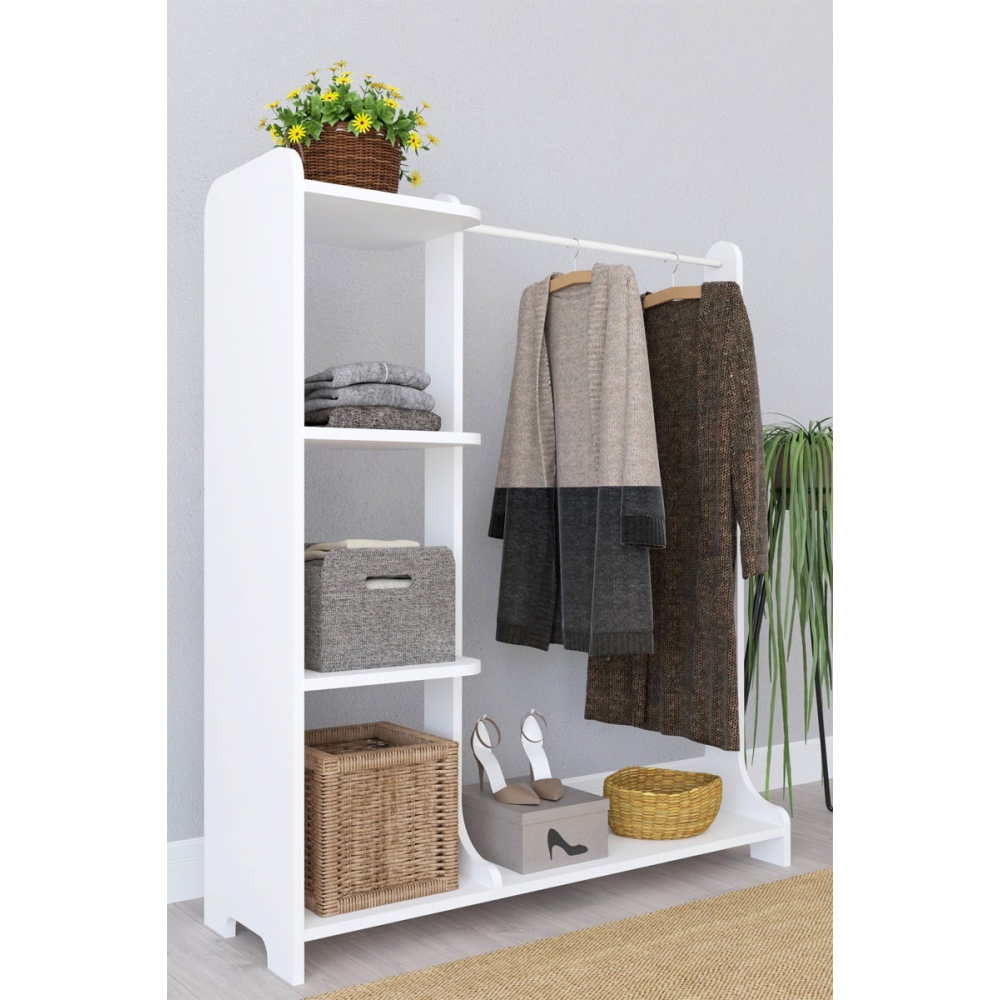 - Διαθέτει μία μεγάλη μεταλλική βέργα για ανοιχτή οργάνωση των παλτών και ρούχων σας καθώς και ράφια που προσφέρονται για αποθήκευση των αξεσουάρ σας ή για δημιουργία διακοσμητικών συνθέσεων.