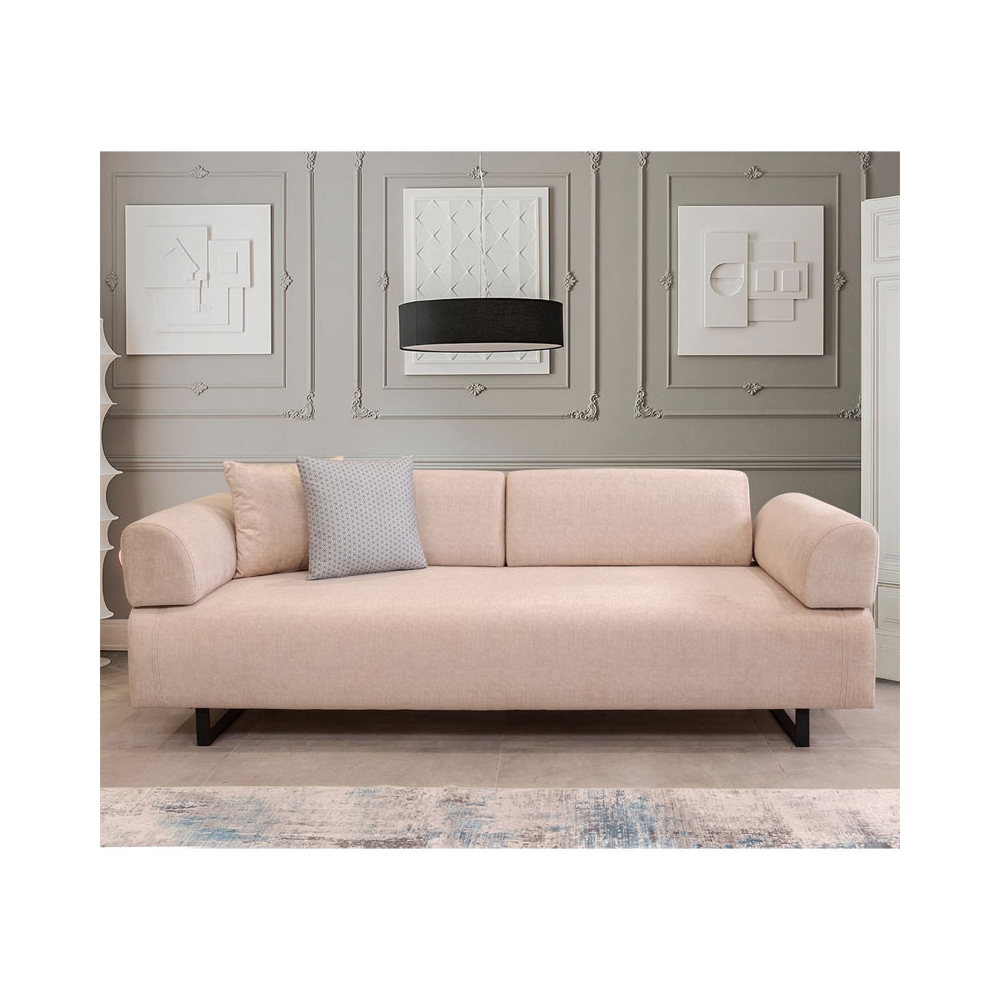 Τεχνικά χαρακτηριστικά: - Εσωτερικός σκελετός: Κατασκευασμένος από ενισχυμένο ξύλο οξιάς και μοριοσανίδα μεγάλης αντοχής. - Foam: 28 & 24 DNS για το κάθισμα και 28 DNS για την πλάτη - Επένδυση με ύφασμα 100% polyester ιδανικό για στεγνό καθάρισμα (dry cleanable). - Τα μαξιλάρια της έδρας (πάχους foam 30 εκ) είναι σταθερά ενώ τα μαξιλάρια της πλάτης (πάχους foam 21 εκ) και των μπράτσων αποσπώνται μετατρέποντας τον καναπέ σε αναπαυτικό κρεβάτι. - Φέρει δύο διακοσμητικά μαξιλάρια διαστάσεων 45 x 45 εκ - Διαθέτει βοηθητικό τραπεζάκι το οποίο εφάπτει πάνω στο σώμα του καναπέ και μπορεί να αφαιρεθεί όταν ο καναπές γίνεται κρεβάτι. - Φέρει πόδια από μέταλλο σε μαύρο χρώμα.