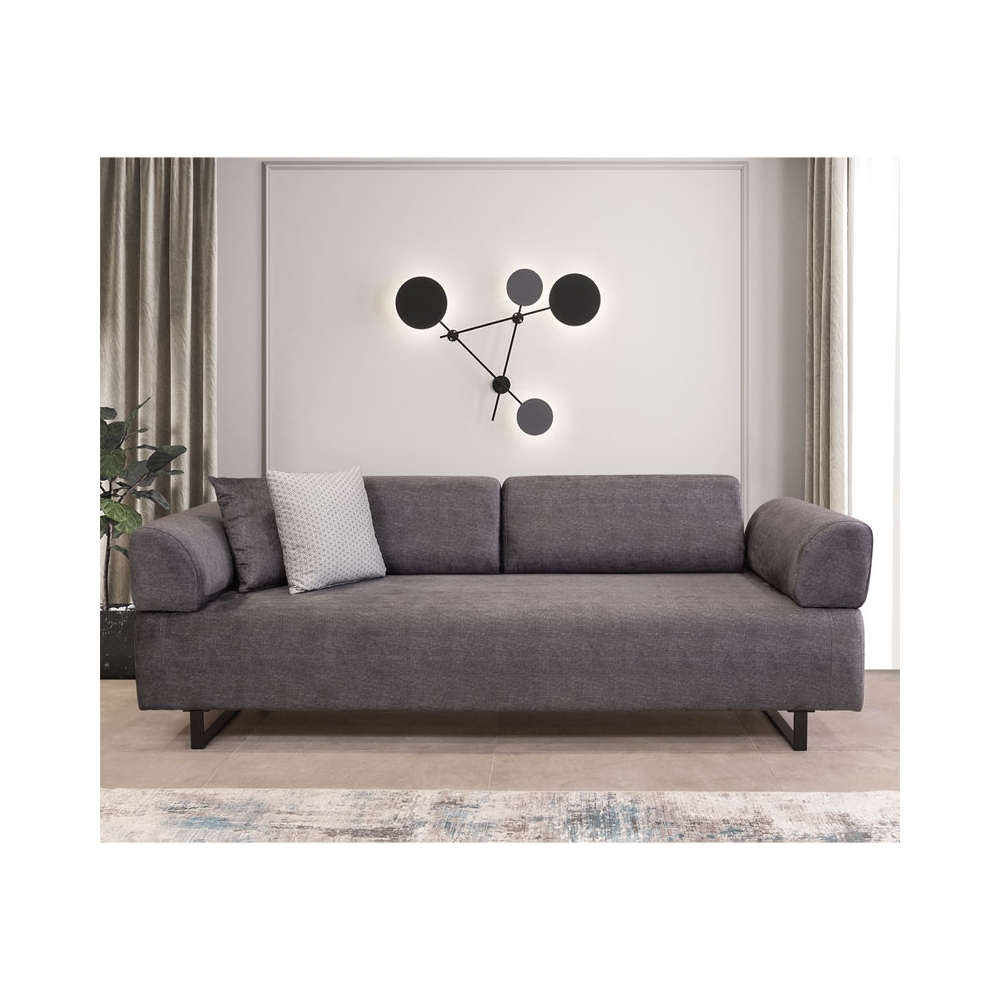Τεχνικά χαρακτηριστικά: - Εσωτερικός σκελετός: Κατασκευασμένος από ενισχυμένο ξύλο οξιάς και μοριοσανίδα μεγάλης αντοχής. - Foam: 28 & 24 DNS για το κάθισμα και 28 DNS για την πλάτη - Επένδυση με ύφασμα 100% polyester ιδανικό για στεγνό καθάρισμα (dry cleanable). - Τα μαξιλάρια της έδρας (πάχους foam 30 εκ) είναι σταθερά ενώ τα μαξιλάρια της πλάτης (πάχους foam 21 εκ) και των μπράτσων αποσπώνται μετατρέποντας τον καναπέ σε αναπαυτικό κρεβάτι. - Φέρει δύο διακοσμητικά μαξιλάρια διαστάσεων 45 x 45 εκ - Διαθέτει βοηθητικό τραπεζάκι το οποίο εφάπτει πάνω στο σώμα του καναπέ και μπορεί να αφαιρεθεί όταν ο καναπές γίνεται κρεβάτι. - Φέρει πόδια από μέταλλο σε μαύρο χρώμα.