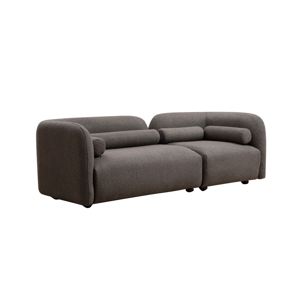 Τεχνικά χαρακτηριστικά: - Εσωτερικός σκελετός: Κατασκευασμένος από ενισχυμένο ξύλο οξιάς και μοριοσανίδα αντοχής με μεγάλη αντοχή στον χρόνο. - Foam: 8 εκ 28 DNS + 5 cm 24 DNS για το κάθισμα. - Επένδυση με ύφασμα μπουκλέ polyester 100% ιδανικό για στεγνό καθάρισμα (Dry-cleanable fabric) - Περιλαμβάνει 2 διακοσμητικά μαξιλάρια. - Στήριξη σε πόδια καρυδί χρώματος.