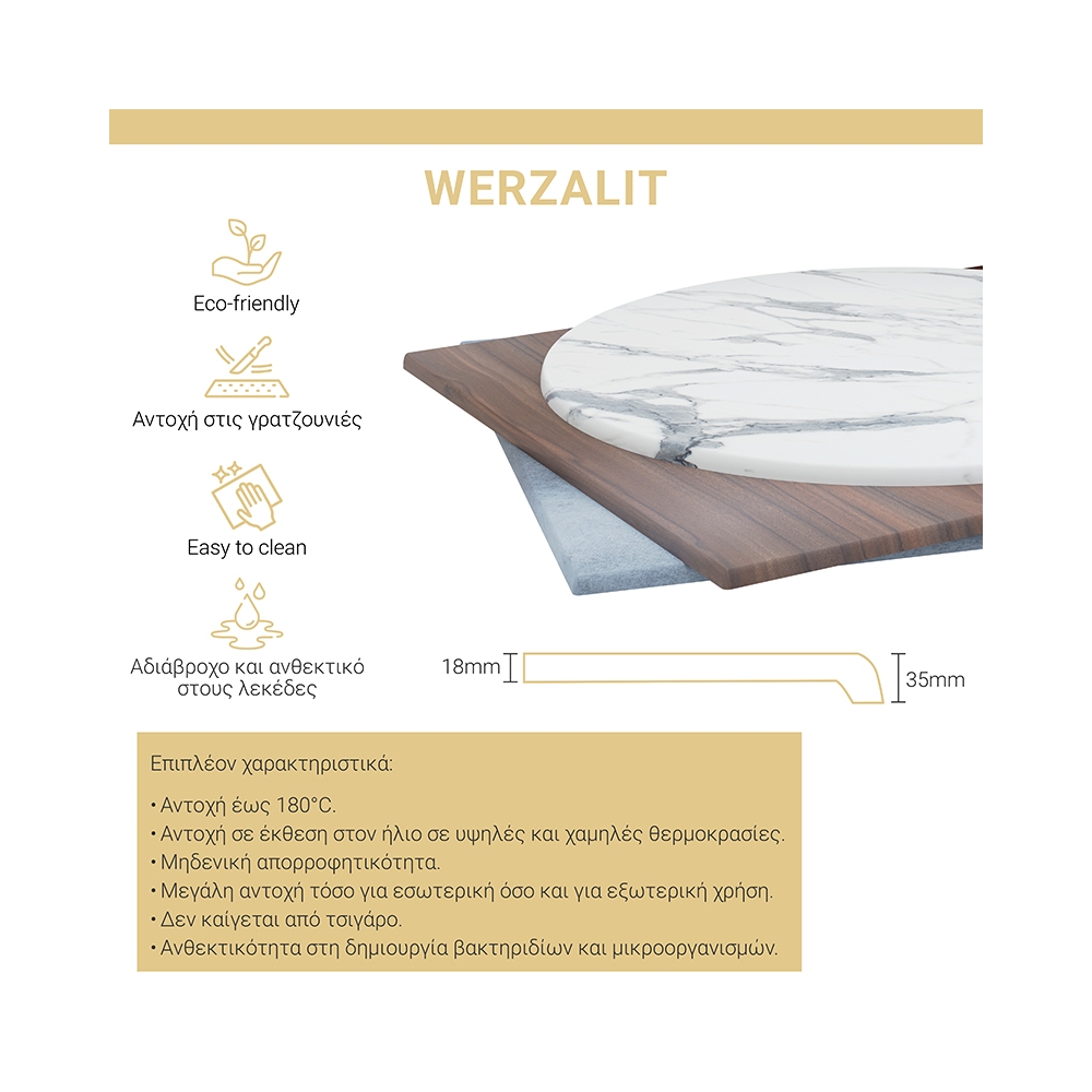 • Η επιφάνεια από Werzalit είναι ένα παράγωγο ξύλου υψηλής ποιότητας, ιδανικό για υψηλές αντοχές στην υγρασία, στο νερό, στην ηλιοφάνεια και στις υψηλές θερμοκρασίες.