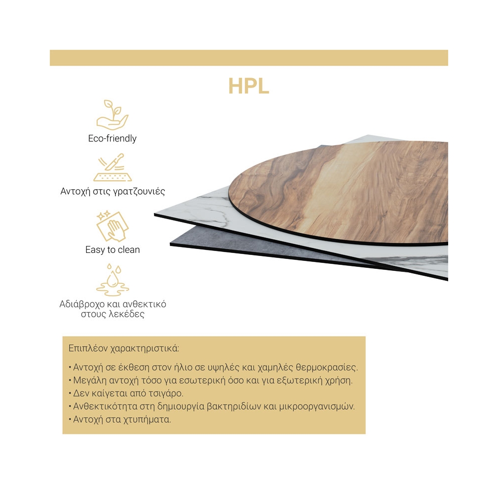 • Η επιφάνεια από HPL (High Pressure Laminated) είναι κατασκευασμένη από θερμοσκληρυνόμενα πολυμερή υλικά υψηλής τεχνολογίας, προσφέροντας εξαιρετική αντοχή στην τριβή, τα ραγίσματα, την υγρασία, τη θερμότητα και τα χημικά. • Φέρει πυρήνα μαύρου χρώματος και πάχους 12mm κατασκευασμένο από λεπτές στρώσεις KRAFT και DECOR χαρτιού φαινόλης και ρητινών μελαμίνης, συμπιεσμένων υπό υψηλή θερμοκρασία και πίεση. • Η επιφάνεια φέρει οδηγό στήριξης για την βάση του τραπεζιού. Δε τρυπιέται αλλά το κεφάλι της βίδας τοποθετείται μέσα στον εγχάρακτο οδηγό και σφίγγει στη μεταλλική βάση με παξιμάδι. • Μία επιφάνεια ιδανική για τον εξοπλισμό επαγγελματικών χώρων: Εστίασης, εστιατόρια, καφετέριες, Airbnb, ξενοδοχεία, snak bar και τουριστικών καταλυμάτων.