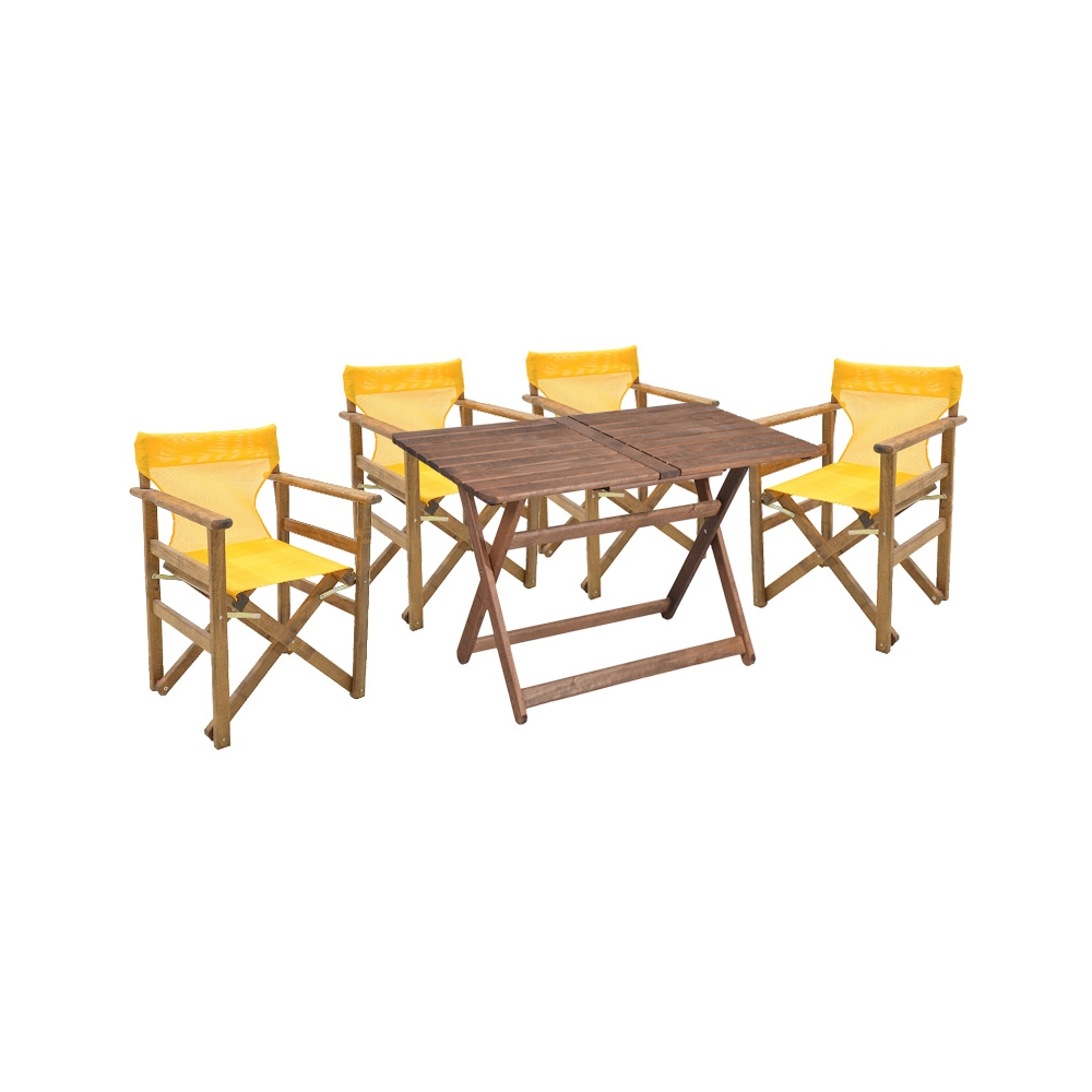Το σετ περιλαμβάνει: * Ένα (1) τραπέζι κήπου Retto από μασίφ ξύλο φουρνιστής οξιάς σε χρώμα καρυδί διάστασης: 120x75x71εκ. * Τέσσερις (4) πολυθρόνες κήπου Retto από μασίφ ξύλο φουρνιστής οξιάς σε χρώμα καρυδί διάστασης: 61x51x86 εκ. * Τέσσερα (4) πανιά διάτρητα σε χρώμα κροκί.