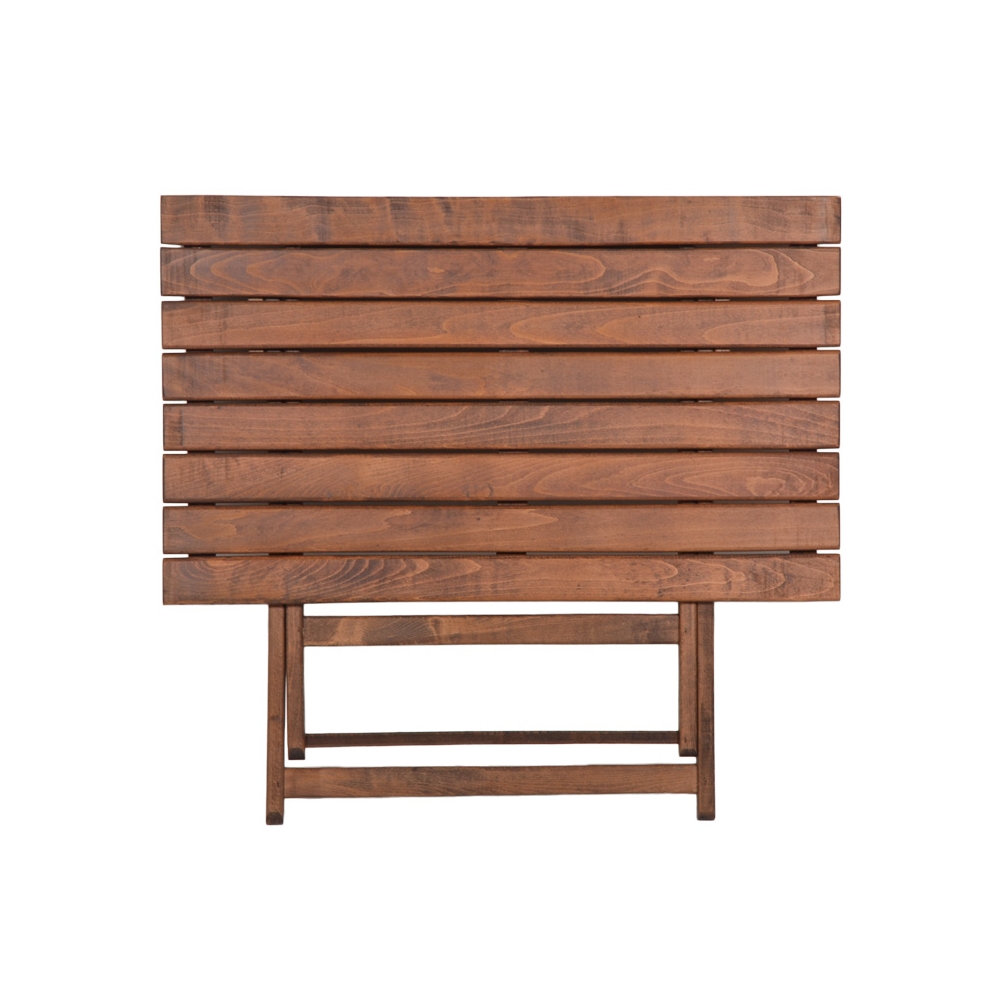 Τεχνικά χαρακτηριστικά: * Κατασκευή από ενισχυμένο μασίφ ξύλινο σκελετό αρίστης ποιότητας από ξύλο φουρνιστής οξιάς σε χρώμα καρυδί και με βερνίκι εμποτισμού για μεγαλύτερη προστασία. * Το τραπέζι είναι πτυσσόμενο για εύκολη αποθήκευση, καταλαμβάνοντας τον ελάχιστο δυνατό χώρο όταν δεν χρησιμοποιείται. * Κλασσικός σχεδιασμός με ορθογώνια επιφάνεια που συνδυάζεται αρμονικά με τα υπόλοιπα προϊόντα της ίδιας σειράς. * Με προδιαγραφές για να αντέχει σε δύσκολες καιρικές συνθήκες, στον χρόνο και την υγρασία. Ενδείκνυται για εξωτερικούς και επαγγελματικούς χώρους.