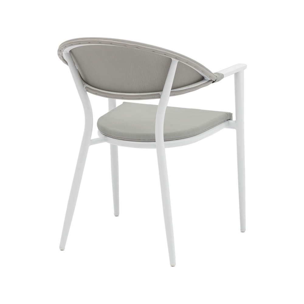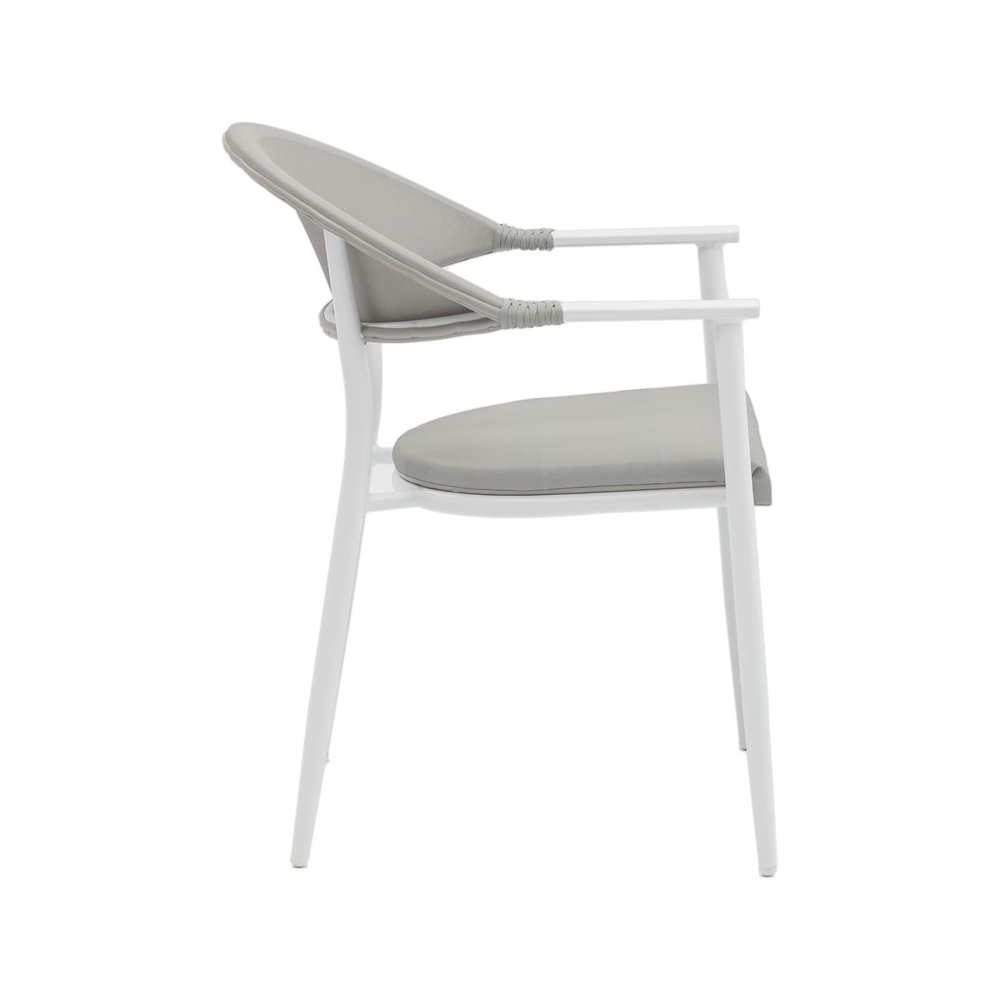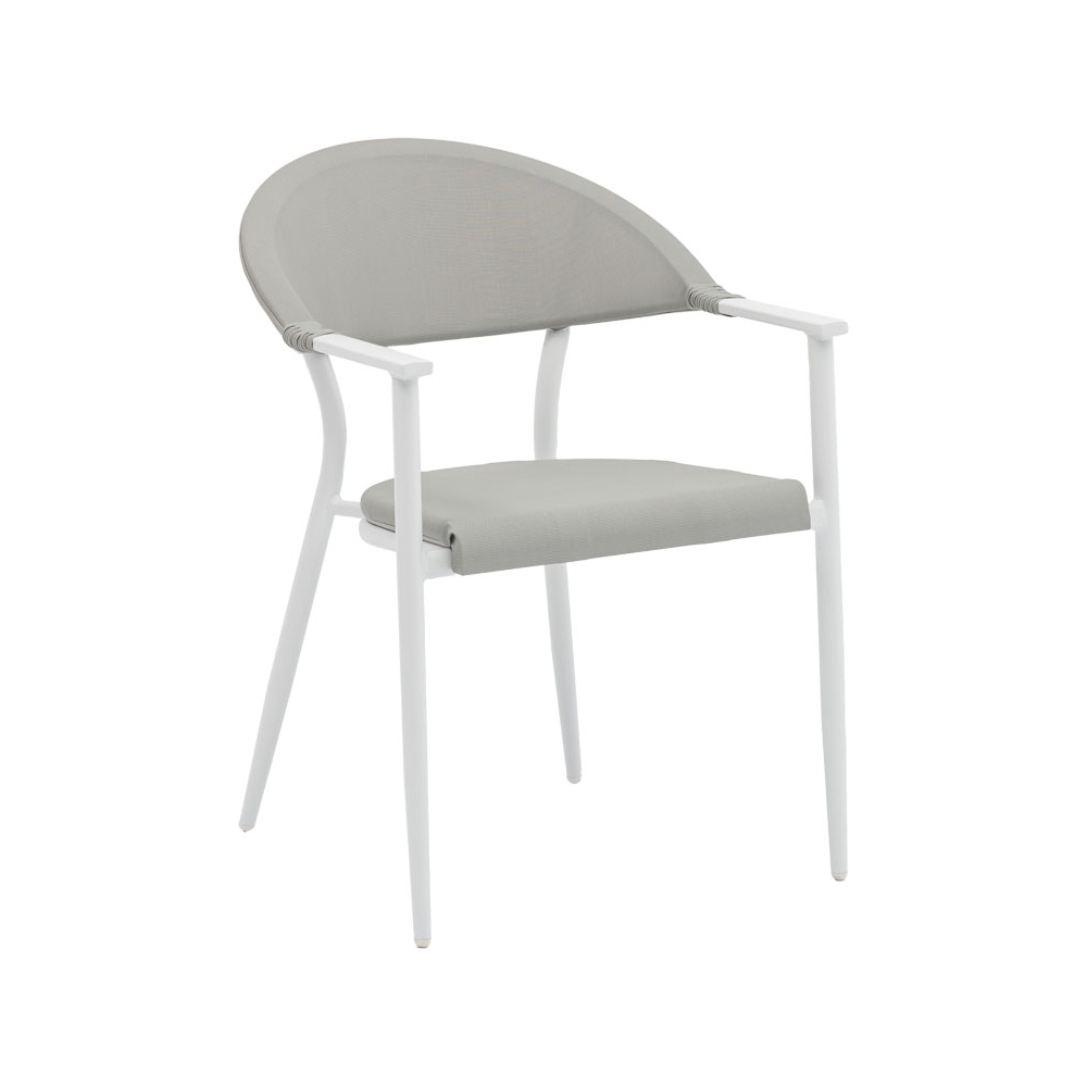 Τεχνικά χαρακτηριστικά: Σταθερός σκελετός από εξαιρετικής ποιότητας αλουμίνιο (Dia.28xT1.5mm) με αντοχή στην καταπόνηση και στη φθορά. Κυρίως σώμα καρέκλας από εξαιρετικής ποιότητας textilene. Το textilene είναι ύφασμα μεγάλης αντοχής στην ηλιακή ακτινοβολία και την υγρασία ενώ παράλληλα αφήνει το δέρμα να "αναπνέει" δημιουργώντας έτσι άνεση στο κάθισμα. Μεγάλη ανθεκτικότητα: κατάλληλο για χρήση σε εξωτερικό χώρο εκτεθειμένο στις καιρικές συνθήκες και την υγρασία. Στοιβαζόμενο: προσφέρει ευκολία στη μεταφορά και στην αποθήκευση. Προσφέρεται σε χρώμα αλουμίνιο λευκό-textilene γκρι