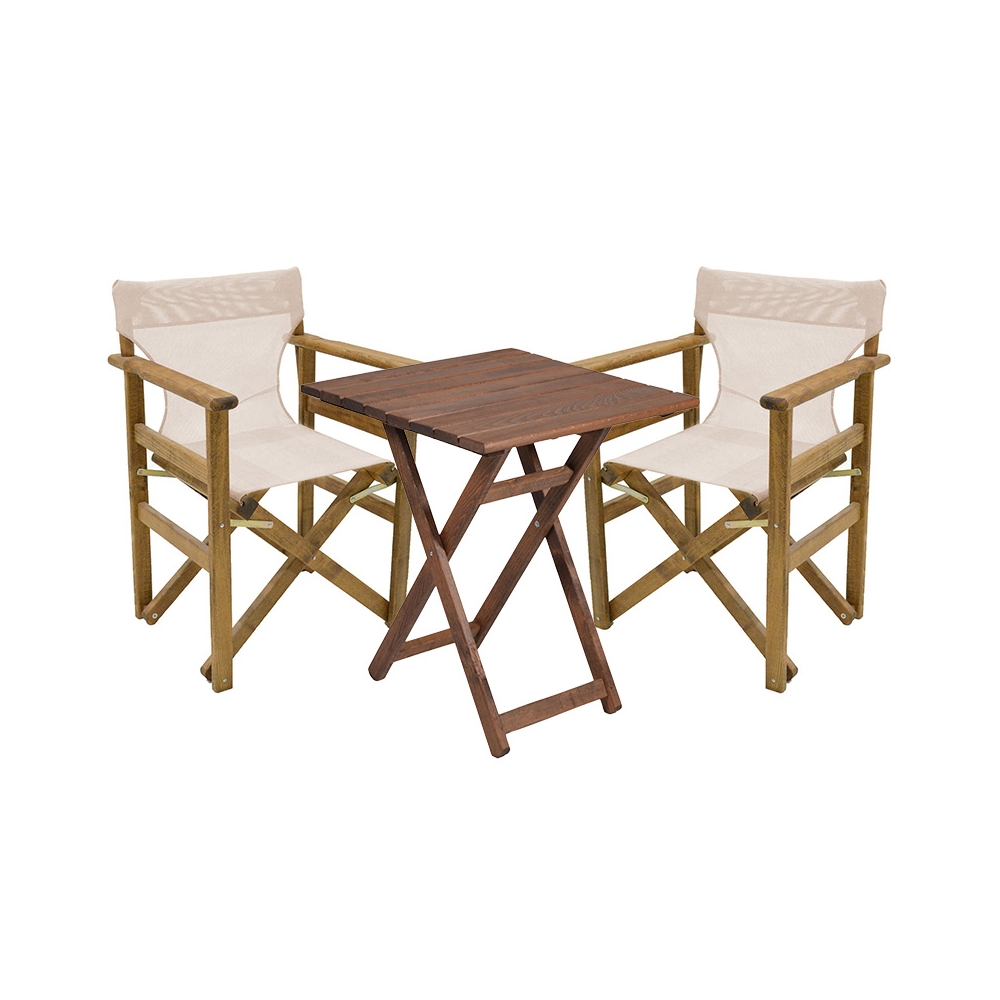 Το σετ περιλαμβάνει: * Ένα (1) τραπέζι κήπου Retto από μασίφ ξύλο φουρνιστής οξιάς σε χρώμα καρυδί διάστασης: 60x60x71εκ. * Δυο (2) πολυθρόνες κήπου Retto από μασίφ ξύλο φουρνιστής οξιάς σε χρώμα καρυδί διάστασης: 61x51x86 εκ. * Δυο (2) πανιά διάτρητα χρώματος μπεζ-λευκό