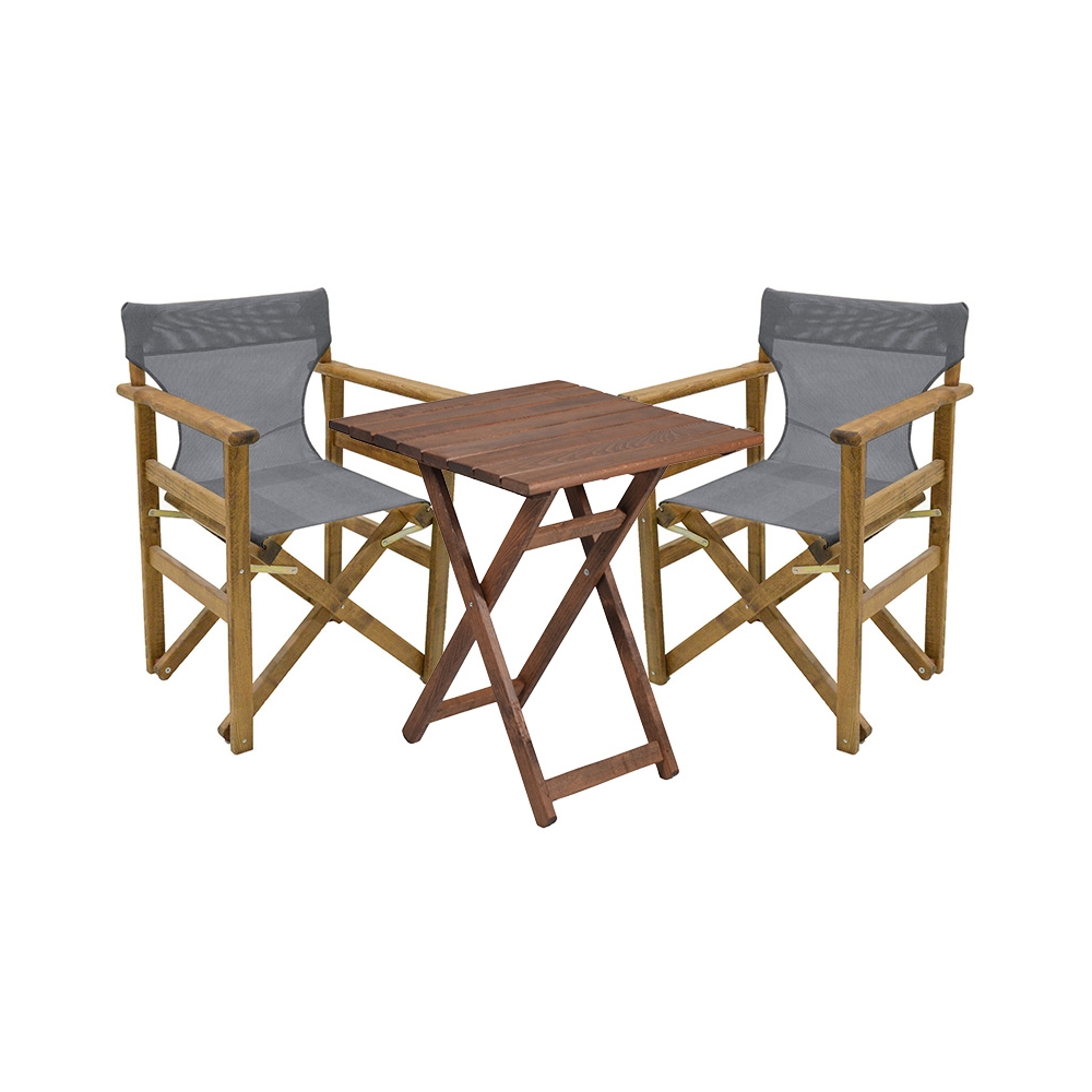 Το σετ περιλαμβάνει: * Ένα (1) τραπέζι κήπου Retto από μασίφ ξύλο φουρνιστής οξιάς σε χρώμα καρυδί διάστασης: 60x60x71εκ. * Δυο (2) πολυθρόνες κήπου Retto από μασίφ ξύλο φουρνιστής οξιάς σε χρώμα καρυδί διάστασης: 61x51x86 εκ. * Δυο (2) πανιά διάτρητα χρώματος γκρι-λευκό