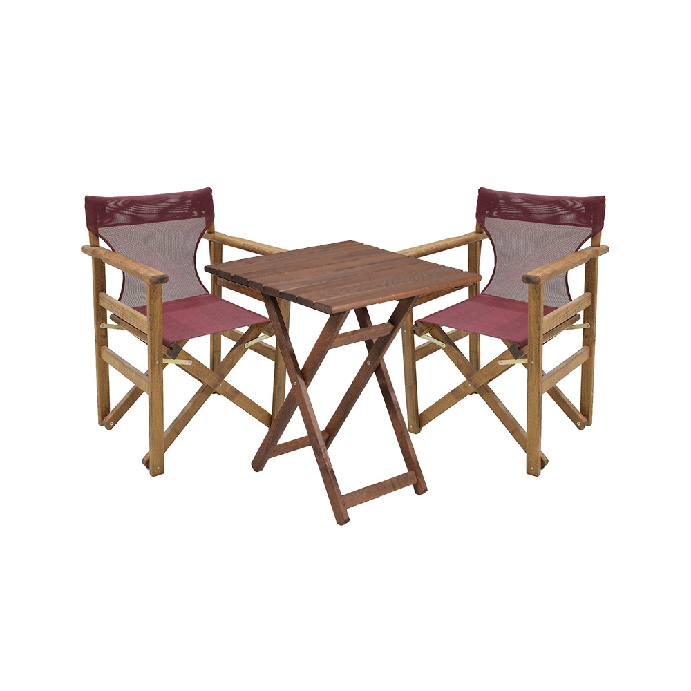 Το σετ περιλαμβάνει: * Ένα (1) τραπέζι κήπου Retto από μασίφ ξύλο φουρνιστής οξιάς σε χρώμα καρυδί διάστασης: 70x70x71εκ. * Δυο (2) πολυθρόνες κήπου Retto από μασίφ ξύλο φουρνιστής οξιάς σε χρώμα καρυδί διάστασης: 61x51x86 εκ. * Δυο (2) πανιά διάτρητα μπορντό