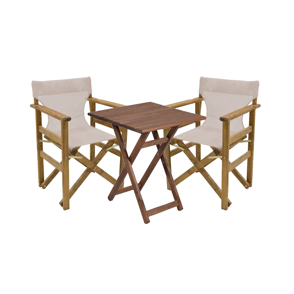 Το σετ περιλαμβάνει: * Ένα (1) τραπέζι κήπου Retto από μασίφ ξύλο φουρνιστής οξιάς σε χρώμα καρυδί διάστασης: 70x70x71εκ * Δυο (2) πολυθρόνες κήπου Retto από μασίφ ξύλο φουρνιστής οξιάς σε χρώμα καρυδί διάστασης: 61x51x86 εκ. * Δυο (2) πανιά διάτρητα πυκνότητας 2x1 χρώματος μπεζ-λευκό.
