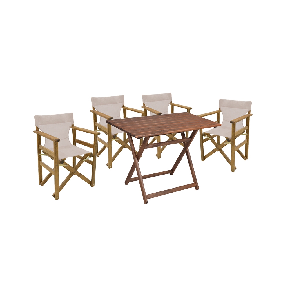 Το σετ περιλαμβάνει: * Ένα (1) τραπέζι κήπου Retto από μασίφ ξύλο φουρνιστής οξιάς σε χρώμα καρυδί διάστασης: 80x60x72εκ. * Τέσσερα (4) πολυθρόνες κήπου Retto από μασίφ ξύλο φουρνιστής οξιάς σε χρώμα καρυδί διάστασης: 61x51x86 εκ. * Τέσσερα (4) πανιά διάτρητα πυκνότητας 2x1 χρώματος μπεζ-λευκό.