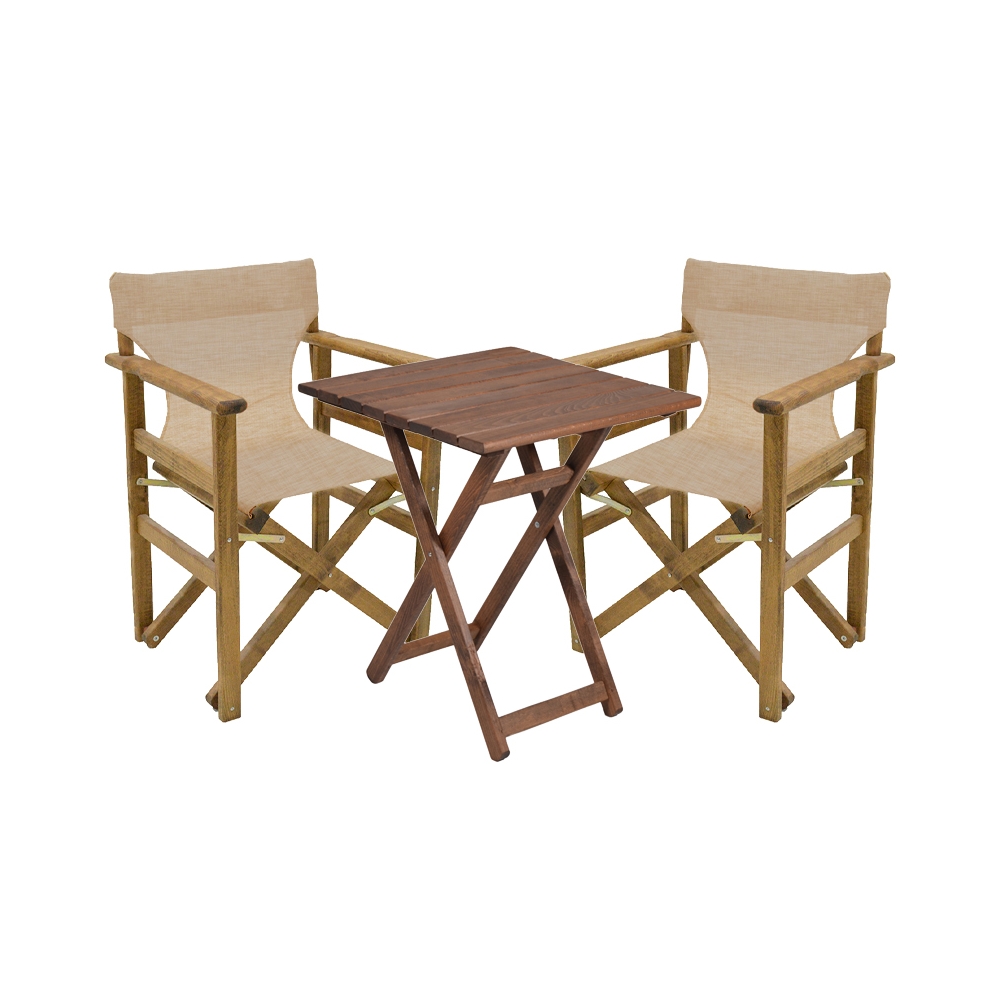Το σετ περιλαμβάνει: * Ένα (1) τραπέζι κήπου Retto από μασίφ ξύλο φουρνιστής οξιάς σε χρώμα καρυδί διάστασης: 60x60x71εκ. * Δυο (2) πολυθρόνες κήπου Retto από μασίφ ξύλο φουρνιστής οξιάς σε χρώμα καρυδί διάστασης: 61x51x86 εκ. * Δυο (2) πανιά διάτρητα πυκνότητας 2x1 χρώματος μπεζ-εκρού.