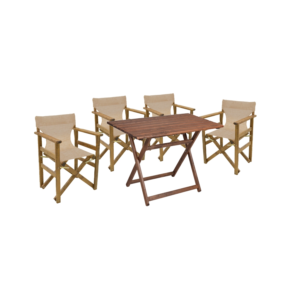 Το σετ περιλαμβάνει: * Ένα (1) τραπέζι κήπου Retto από μασίφ ξύλο φουρνιστής οξιάς σε χρώμα καρυδί διάστασης: 100x60x71εκ * Τέσσερα (4) πολυθρόνες κήπου Retto από μασίφ ξύλο φουρνιστής οξιάς σε χρώμα καρυδί διάστασης: 61x51x86 εκ. * Τέσσερα (4) πανιά διάτρητα πυκνότητας 2x1 χρώματος μπεζ-εκρού .