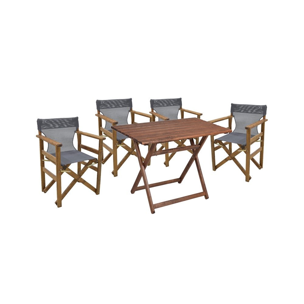 Το σετ περιλαμβάνει: * Ένα (1) τραπέζι κήπου Retto από μασίφ ξύλο φουρνιστής οξιάς σε χρώμα καρυδί διάστασης: 80x60x72εκ. * Τέσσερα (4) πολυθρόνες κήπου Retto από μασίφ ξύλο φουρνιστής οξιάς σε χρώμα καρυδί διάστασης: 61x51x86 εκ. * Τέσσερα (4) πανιά διάτρητα πυκνότητας 2x1 χρώματος γκρι-λευκό.
