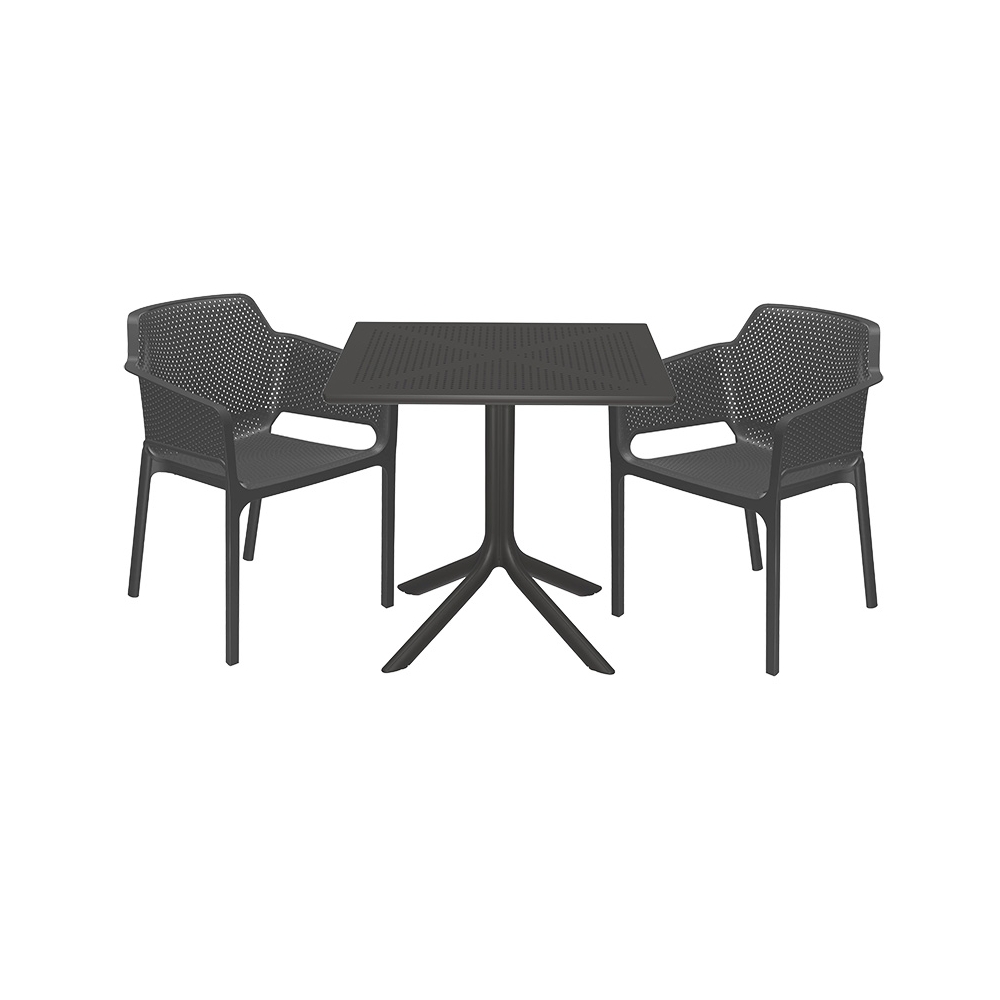 Τεχνικά χαρακτηριστικά τραπεζιού: * Κατασκευή από εξαιρετικής ποιότητας διάτρητο πολυπροπυλένιο (PP). * Ανθεκτικότητα: Το πολυπροπυλένιο είναι υλικό με μεγάλη αντοχή στις συνθήκες του εξωτερικού περιβάλλοντος (έκθεση σε υγρασία, αέρα, χρήση χημικών κτλ). Μπορεί να καθαριστεί εύκολα με ένα υγρό πανί ή τρεχούμενο νερό, ενώ είναι ένα ανακυκλώσιμο υλικό φιλικό προς το περιβάλλον. * Φέρει ενισχυμένο φίλτρο ηλιοπροστασίας UV για πολύωρη έκθεση στον ήλιο και σε εξωτερικές συνθήκες. * Προσφέρεται σε χρώμα ανθρακί Διαστάσεις προϊόντος: 80x80x74.5εκ