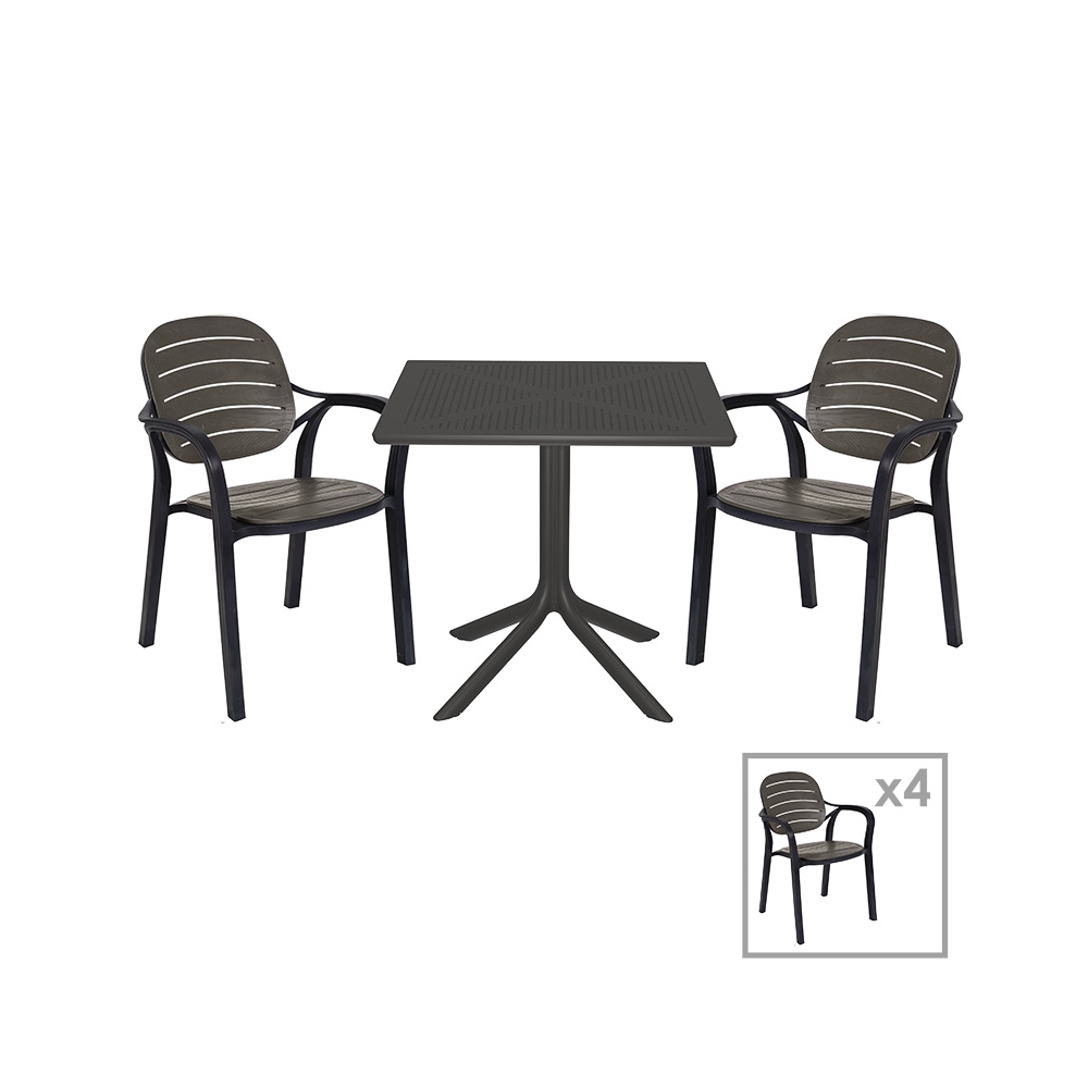 Τεχνικά χαρακτηριστικά τραπεζιού: * Κατασκευή από εξαιρετικής ποιότητας διάτρητο πολυπροπυλένιο (PP). * Ανθεκτικότητα: Το πολυπροπυλένιο είναι υλικό με μεγάλη αντοχή στις συνθήκες του εξωτερικού περιβάλλοντος (έκθεση σε υγρασία, αέρα, χρήση χημικών κτλ). Μπορεί να καθαριστεί εύκολα με ένα υγρό πανί ή τρεχούμενο νερό, ενώ είναι ένα ανακυκλώσιμο υλικό φιλικό προς το περιβάλλον. * Φέρει ενισχυμένο φίλτρο ηλιοπροστασίας UV για πολύωρη έκθεση στον ήλιο και σε εξωτερικές συνθήκες. * Προσφέρεται σε χρώμα ανθρακί Διαστάσεις προϊόντος: 80x80x74.5εκ