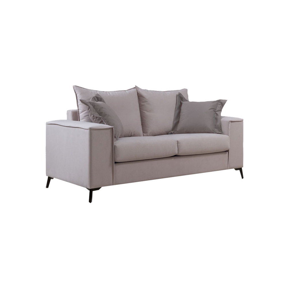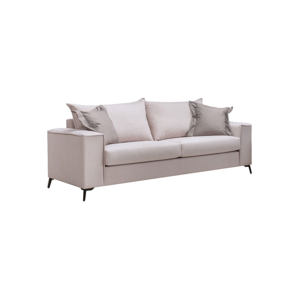 Τεχνικά χαρακτηριστικά: Κατασκευή από: - Σκελετό μοριοσανίδας, ξύλο λεύκας και επένδυση MDF + αφρολέξ - Μαξιλάρι καθίσματος αφρολέξ 400άρι plus, με διπλή βάτα ενισχυμένη με ελαστικές ίνες και μαξιλάρι πλάτης από 100% καθαρή σιλικόνη. - Ποδαρικό από υψηλής ποιότητας μέταλλο σε μαύρο χρώμα. - Φέρει επένδυση υφάσματος Easy Clean (90% αδιάβροχο) εξαιρετικής ποιότητας και αντοχής. Όλα τα μαξιλάρια (πλάτης και έδρας) έχουν φερμουάρ και μπορούν να πληθούν στους 30 βαθμούς. -Χρώμα καναπέ και μαξιλαριών πλάτης: cream - Φέρει δύο διακοσμητικά μαξιλαράκια σε mocha χρώμα.