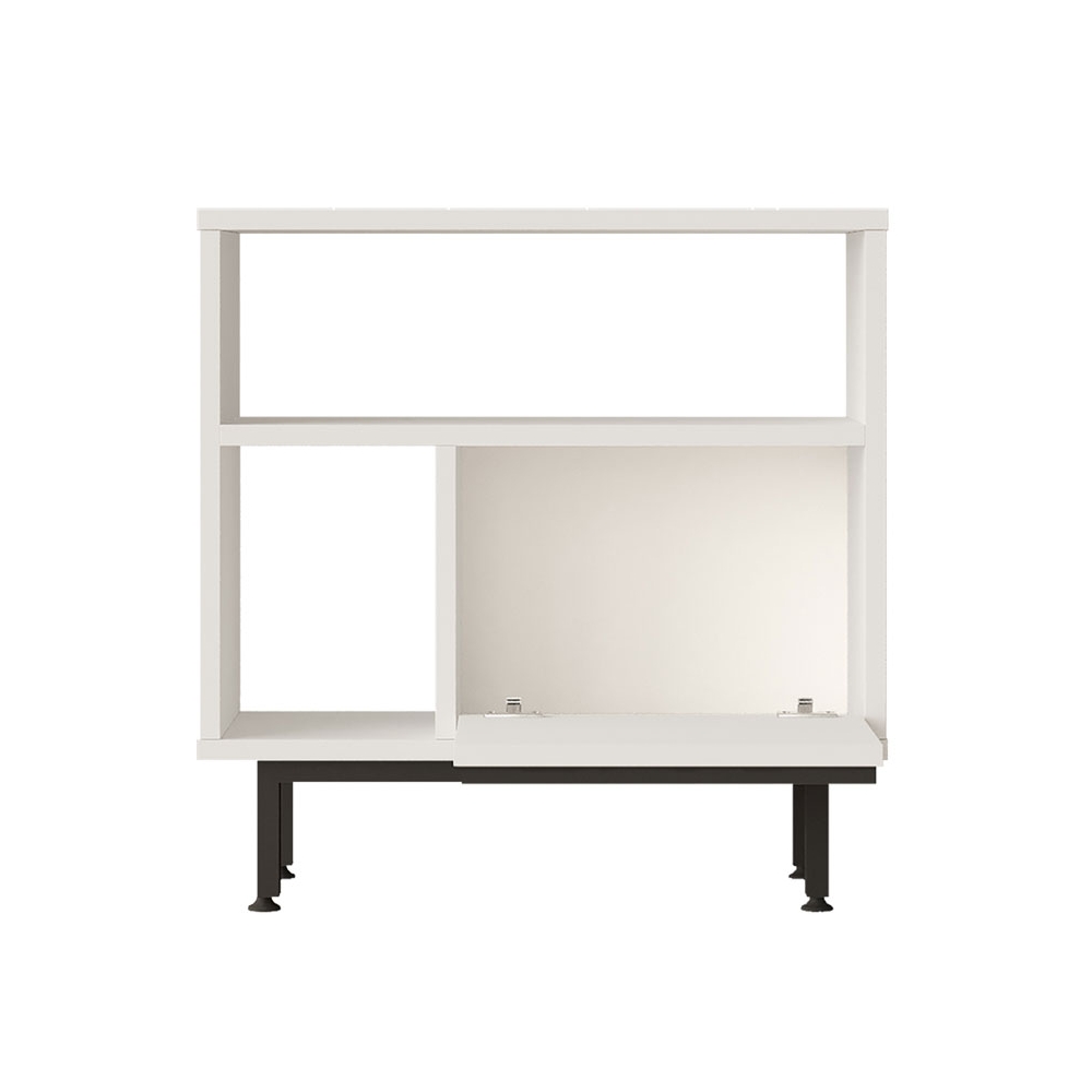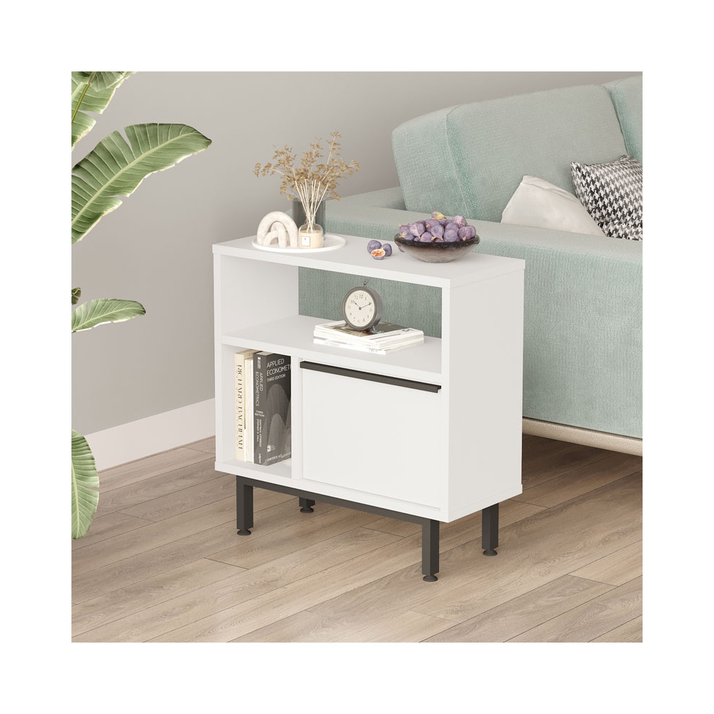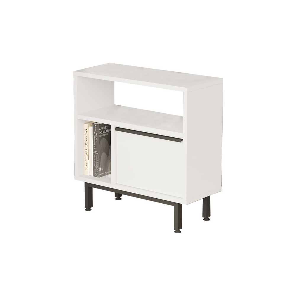 Τεχνικά χαρακτηριστικά: * Σταθερός σκελετός από μοριοσανίδα με επένδυση μελαμίνης με αντοχή στη φθορά και στο χρόνο. * Διαθέτει δύο ράφια για στήριξη διακοσμητικών αντικειμένων ή δημιουργία διακοσμητικών συνθέσεων, καθώς και έναν κλειστό αποθηκευτικό χώρο για μεγαλύτερη αποθήκευση. * Στήριξη σε τέσσερα πόδια πολυπροπυλενίου σε μαύρο χρώμα. * Προσφέρεται σε χρώμα λευκό.