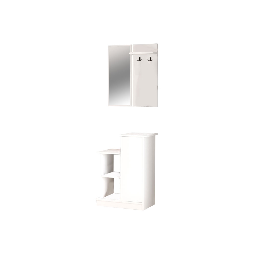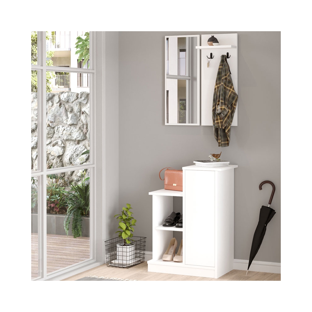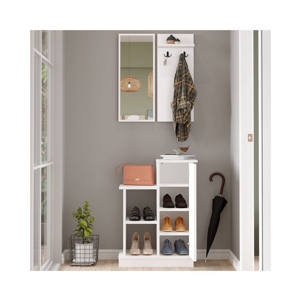 Τεχνικά χαρακτηριστικά: * Σταθερός σκελετός από μοριοσανίδα με επένδυση μελαμίνης με αντοχή στη φθορά και στο χρόνο. * Διαθέτει ντουλάπι με τέσσερα ράφια στο εσωτερικό του, δύο ράφια για ανοιχτή στήριξη και αποθήκευση παπουτσιών, αντικειμένων. * Φέρει κρεμάστρες που είναι ιδανικές για την τοποθέτηση των παλτών και των ρούχων σας, καθώς και ένα ράφι ακριβώς πάνω για την δημιουργία διακοσμητικών συνθέσεων. * Διαθέτει καθρέπτη που προσθέτει στην πρακτικότητα του. * Προσφέρεται σε χρώμα λευκό