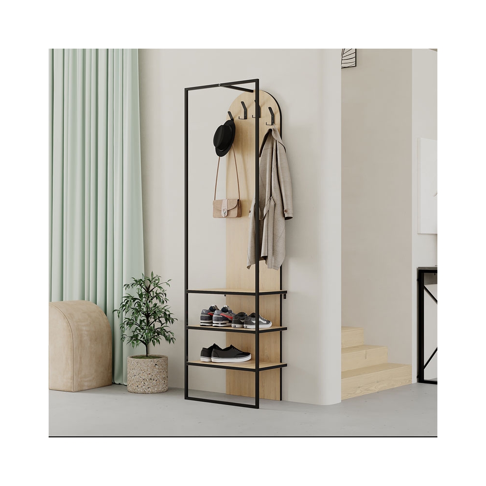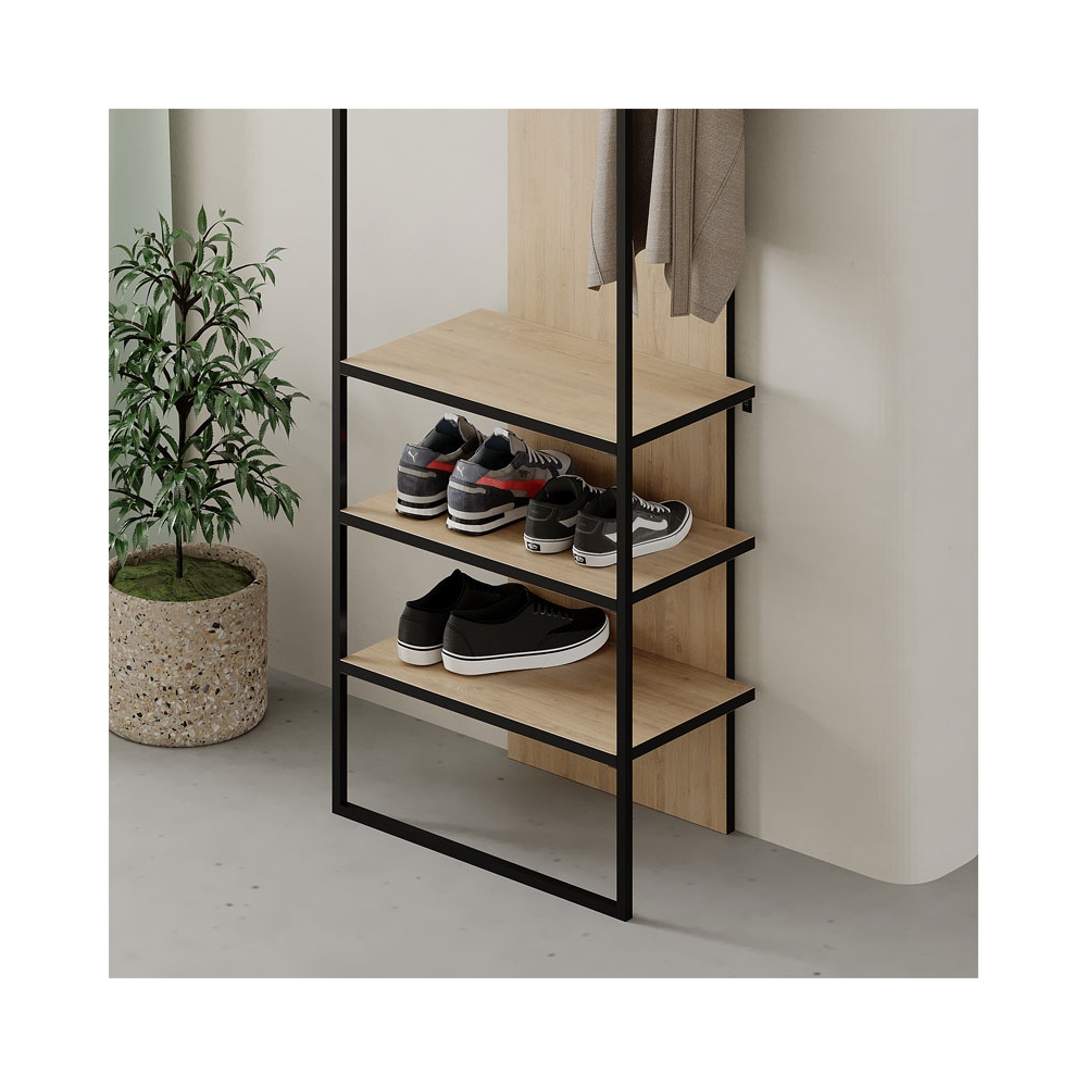 Τεχνικά χαρακτηριστικά: * Κατασκευή από μοριοσανίδα με επένδυση μελαμίνης υψηλής ποιότητας με αντοχή στην καταπόνηση και στον χρόνο. * Σκελετός κατασκευασμένος από μέταλλο μαύρου χρώματος υψηλής ανθεκτικότητας. * Προσφέρεται σε χρώμα φυσικό. * Η σύνθεση περιλαμβάνει: τρία ράφια για βοηθητικούς χώρους, κρεμάστρα (τέσσερα γαντζάκια) για ρούχα και αξεσουάρ.