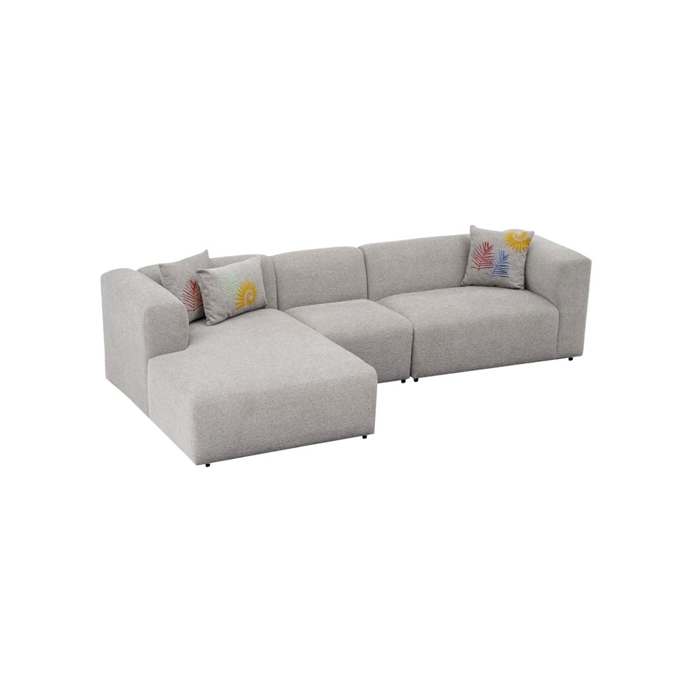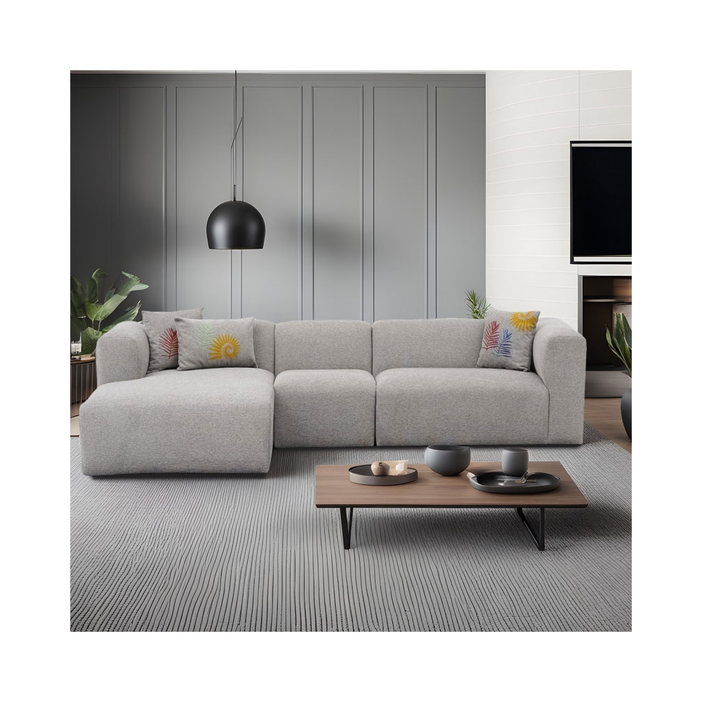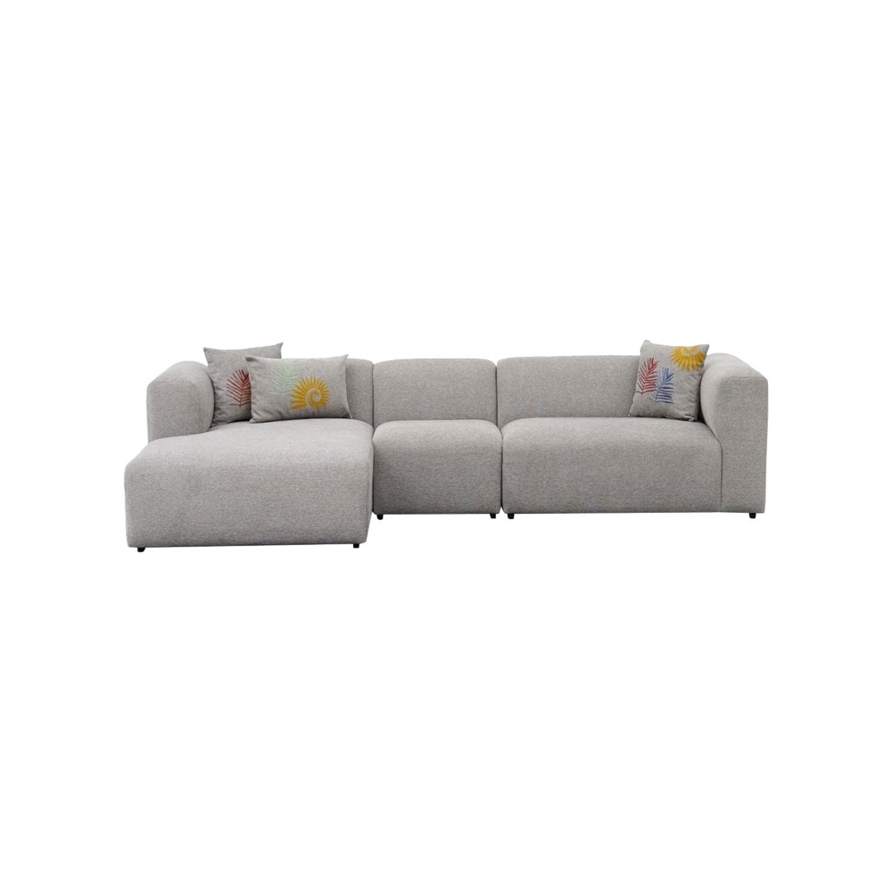 Τεχνικά χαρακτηριστικά: - Εσωτερικός ενισχυμένος σκελετός από ξύλο οξιάς (beech wood), το οποίο έχει ομοιογενή υφή με λεία επιφάνεια, κάτι που το καθιστά ιδανικό για κατασκευή έπιπλων. Είναι επίσης σκληρό και ανθεκτικό στον χρόνο. - Foam: 30 DNS για το κάθισμα και 26 DNS για την πλάτη. - Επένδυση με ύφασμα 100% polyester σε ανοιχτό γκρι χρώμα. -Φέρει τρία διακοσμητικά μαξιλάρια ιδίου χρώματος με τον καναπέ με σχέδια. - Στήριξη σε πόδια πολυπροπυλενίου μαύρου χρώματος εξαιρετικής αντοχής στον χρόνο.