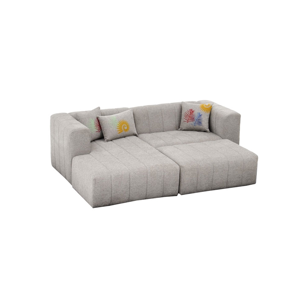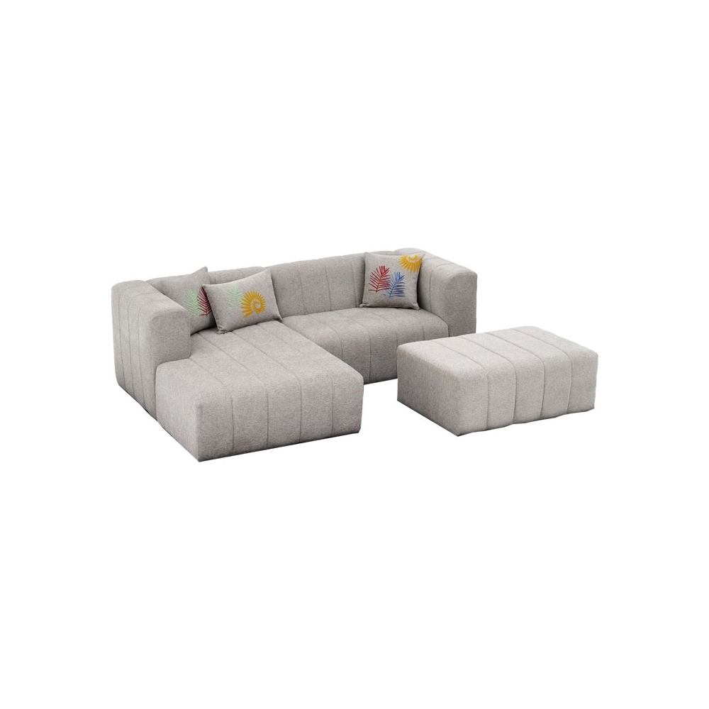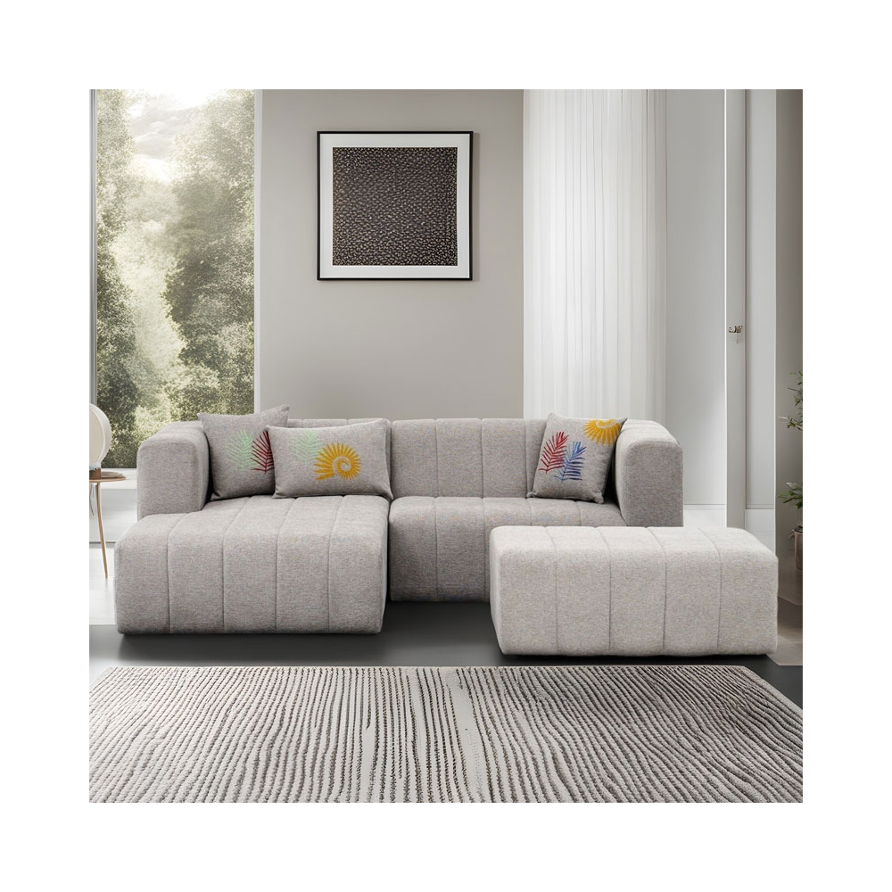Τεχνικά χαρακτηριστικά: - Εσωτερικός ενισχυμένος σκελετός από ξύλο οξιάς (beech wood), το οποίο έχει ομοιογενή υφή με λεία επιφάνεια, κάτι που το καθιστά ιδανικό για κατασκευή έπιπλων. Είναι επίσης σκληρό και ανθεκτικό στον χρόνο. - Foam: 30 DNS για το κάθισμα και 26 DNS για την πλάτη. - Επένδυση με ύφασμα 100% polyester σε ανοιχτό γκρι χρώμα. -Φέρει τρία διακοσμητικά μαξιλάρια ιδίου χρώματος με τον καναπέ με σχέδια. - Στήριξη σε πέντε πόδια πολυπροπυλενίου μαύρου χρώματος εξαιρετικής αντοχής στον χρόνο. -Φέρει υποπόδιο ιδίου χρώματος με τον καναπέ προσφέροντας καλύτερη ξεκούραση.