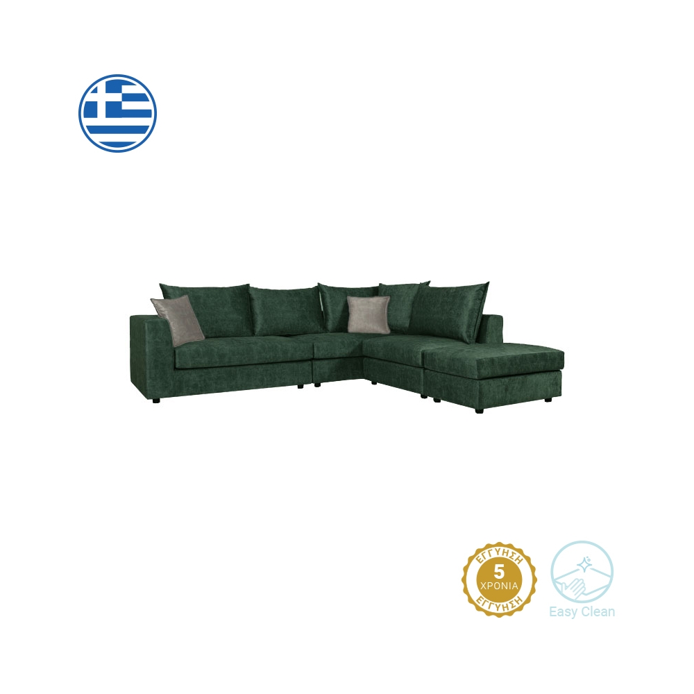 Τεχνικά χαρακτηριστικά: Κατασκευή από: - Σκελετό μοριοσανίδας, ξύλο λεύκας και επένδυση MDF + αφρολέξ - Μαξιλάρι καθίσματος αφρολέξ 400άρι plus, με διπλή βάτα ενισχυμένη με ελαστικές ίνες και μαξιλάρι πλάτης από 100% καθαρή σιλικόνη. - Ποδαρικό από υψηλής ποιότητας μέταλλο σε μαύρο χρώμα. - Φέρει επένδυση υφάσματος Easy Clean (90% αδιάβροχο) εξαιρετικής ποιότητας και αντοχής. Όλα τα μαξιλάρια (πλάτης και έδρας) έχουν φερμουάρ και μπορούν να πληθούν στους 30 βαθμούς. -Χρώμα καναπέ και μαξιλαριών πλάτης: πράσινο αντικέ - Φέρει δύο διακοσμητικά μαξιλαράκια σε εκρού χρώμα.
