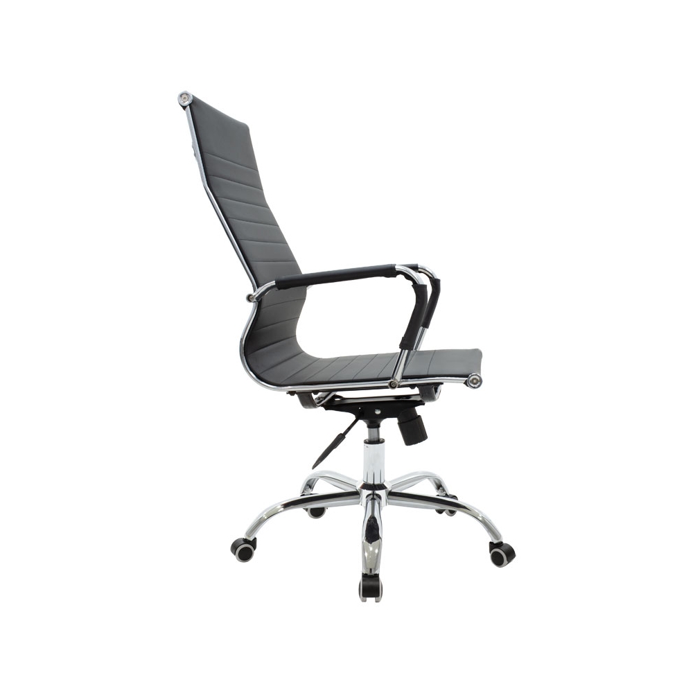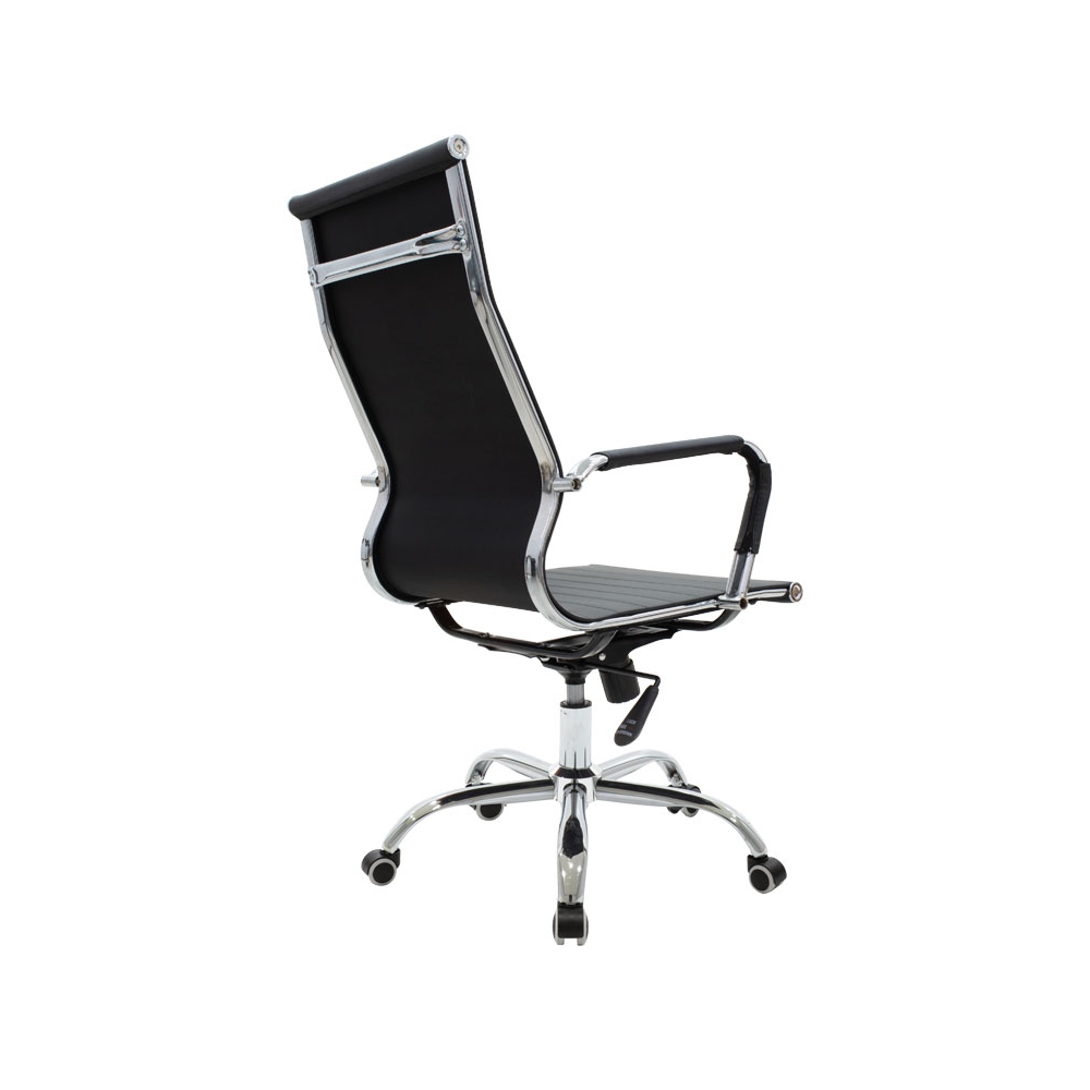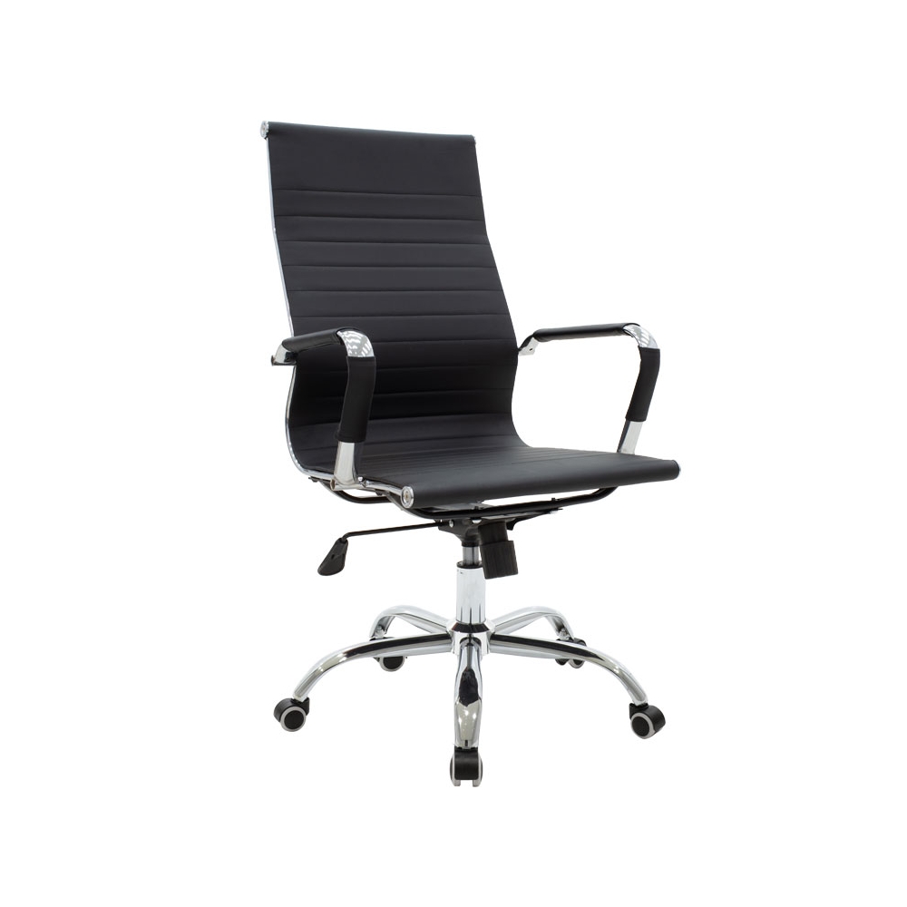 Τεχνικές προδιαγραφές: * Μηχανισμός Tilt / Ανακλινόμενη πλάτη: Το κάθισμα ακολουθεί την κλίση του σώματος μπρος – πίσω, προσφέροντας πλήρη ελευθερία κινήσεων, αλλά και εργονομική στήριξη της μέσης και της σπονδυλικής στήλης. Ο μηχανισμός μπορεί να ασφαλίσει στην κάθετη στάση. * Ρυθμιζόμενο ύψος: Δυνατότητα να προσαρμόζεται και να “κλειδώνει” το κάθισμα στην κατάλληλη εργονομική θέση, ανάλογα με το ύψος του χρήστη. Σύμφωνα με την εργονομία τα πόδια πρέπει να σχηματίζουν ορθή γωνία 90 μοιρών με το πάτωμα. * Ανθεκτικός μεταλλικός σκελετός: Έδραση σε τροχήλατη πεντακτινωτή μεταλλική βάση χρωμίου υψηλών αντοχών. * Τεχνόδερμα Pu: Επένδυση με τεχνόδερμα αντοχής που παρέχει ανθεκτικότητα στον χρόνο αλλά και την δυνατότητα του εύκολου καθαρισμού. Προσφέρεται σε κλασσικό μαύρο χρώμα. * Σχεδιασμός ψηλής πλάτης που ακολουθεί την σπονδυλική στήλη για μεγαλύτερη ανατομία,.με σχέδιο ενισχυμένων οριζόντιων ραφών. * Ανατομικό μπράτσο που ακολουθεί την κλίση των χεριών, ενισχυμένο με τεχνόδερμα για μεγαλύτερη άνεση. * Ενισχυμένη μπουκάλα στήριξης επιπέδου class 3 .