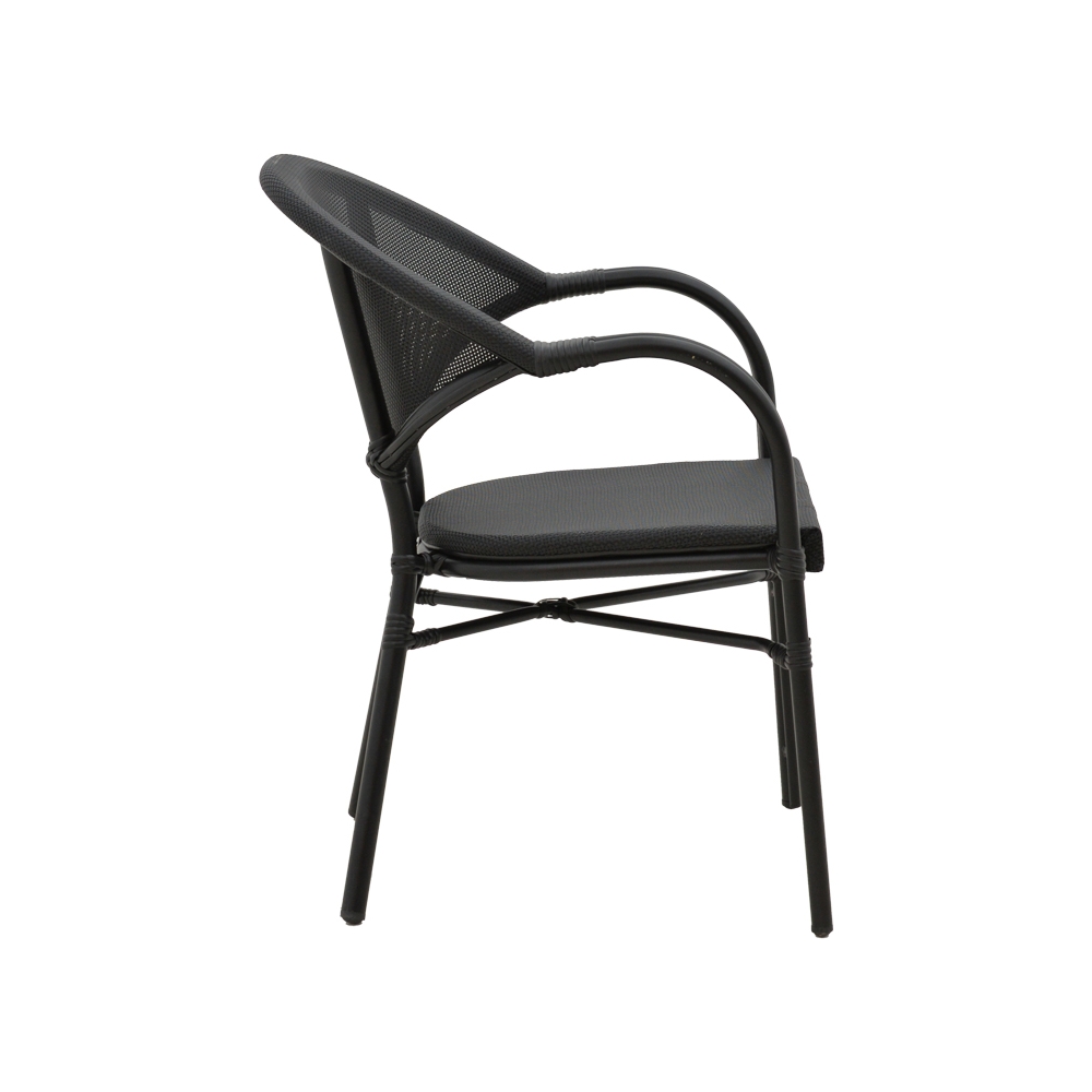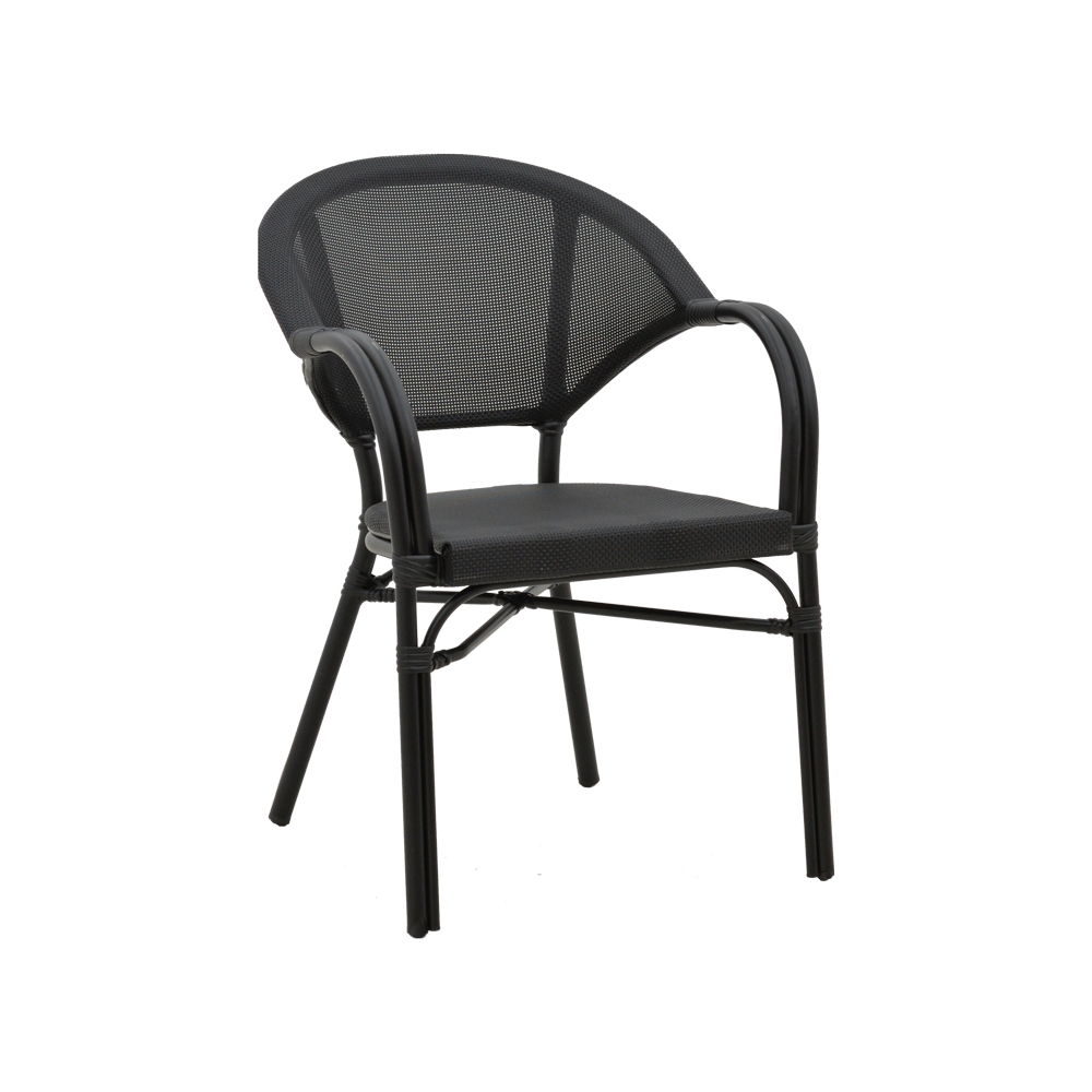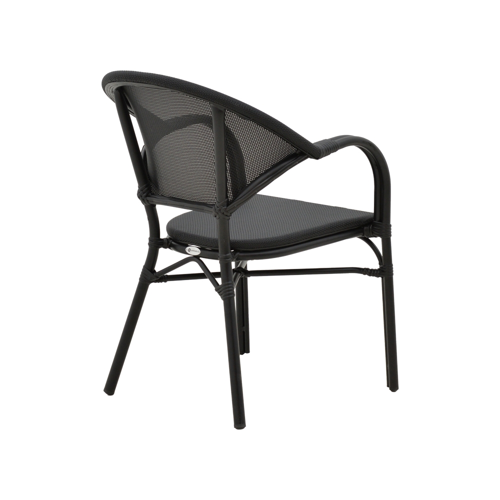 Τεχνικά χαρακτηριστικά: * Σκελετός από εξαιρετικά ανθεκτικό αλουμίνιο με αντοχή στη φθορά και στο χρόνο. * Επένδυση καθίσματος με εξαιρετικής ποιότητας ύφασμα textilene. Το textilene είναι πλενόμενο και ανθεκτικό στις συνθήκες του εξωτερικού πέριβάλλοντος (ηλιακή ακτινοβολία, υγρασία). * Διατίθεται σε χρώμα μαύρο με textilene σε μαύρη απόχρωση. *Μεγάλη ανθεκτικότητα: κατάλληλο για χρήση σε εξωτερικό χώρο εκτεθειμένο σε καιρικές συνθήκες κι υγρασία.