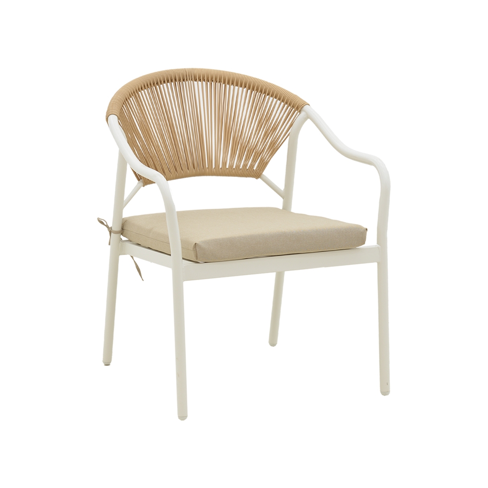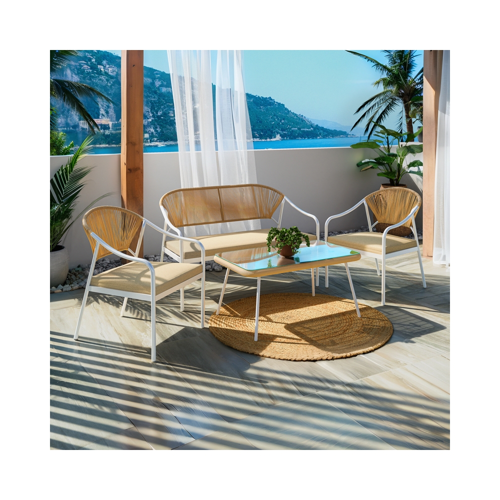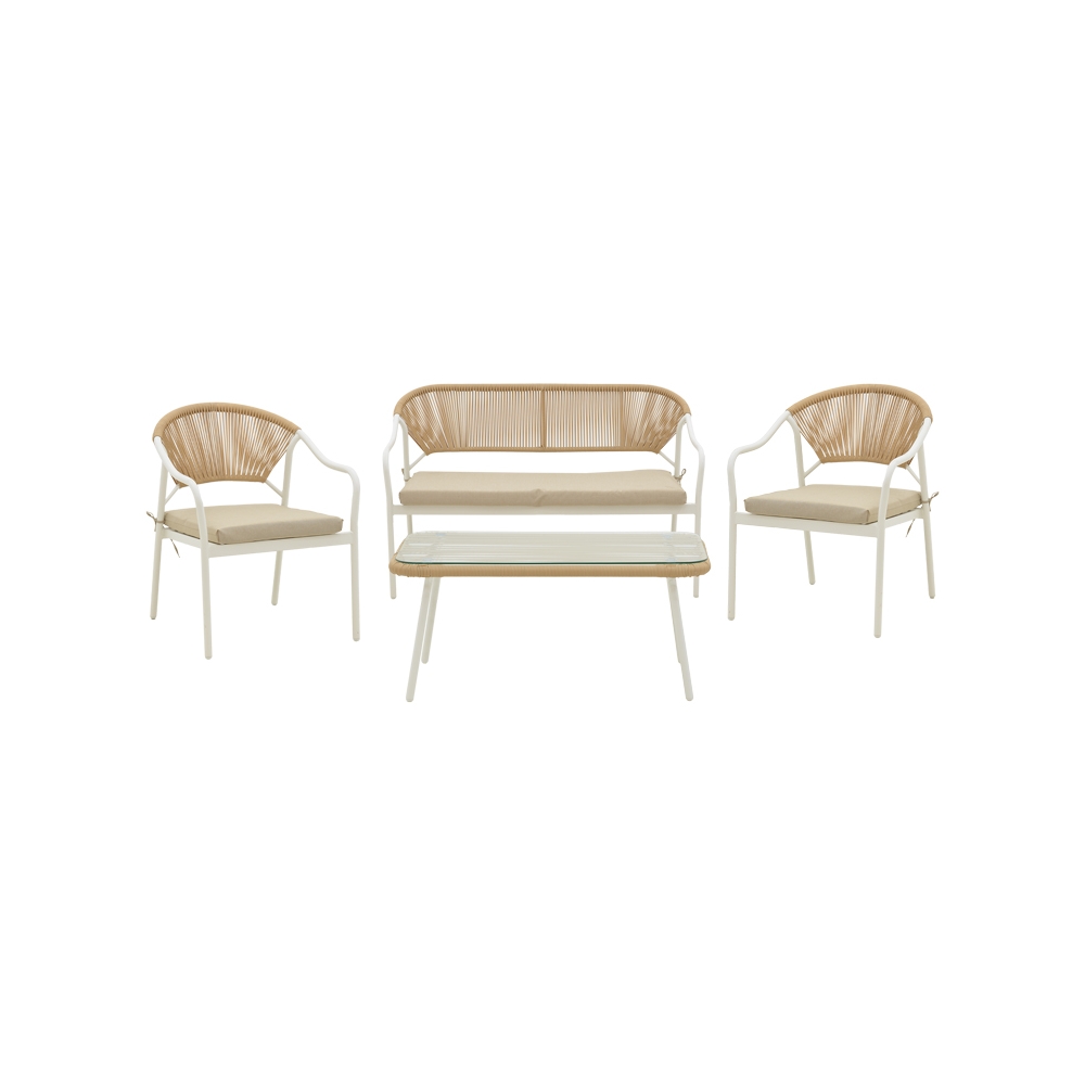 Τεχνικά χαρακτηριστικά: * Κατασκευή από μέταλλο υλικό που προσφέρει ανθεκτικότητα σε φθορά και χρήση. * Φέρει ενισχυμένο φίλτρο ηλιοπροστασίας UV για πολύωρη έκθεση στον ήλιο και σε εξωτερικές συνθήκες. * Προσφέρεται σε χρώμα μπεζ-λευκό * Τα μαξιλάρια φέρουν φερμουάρ και αφαιρούνται τα καλύμματα. * Το τραπέζι φέρει διαφανές γυαλί ασφαλείας.