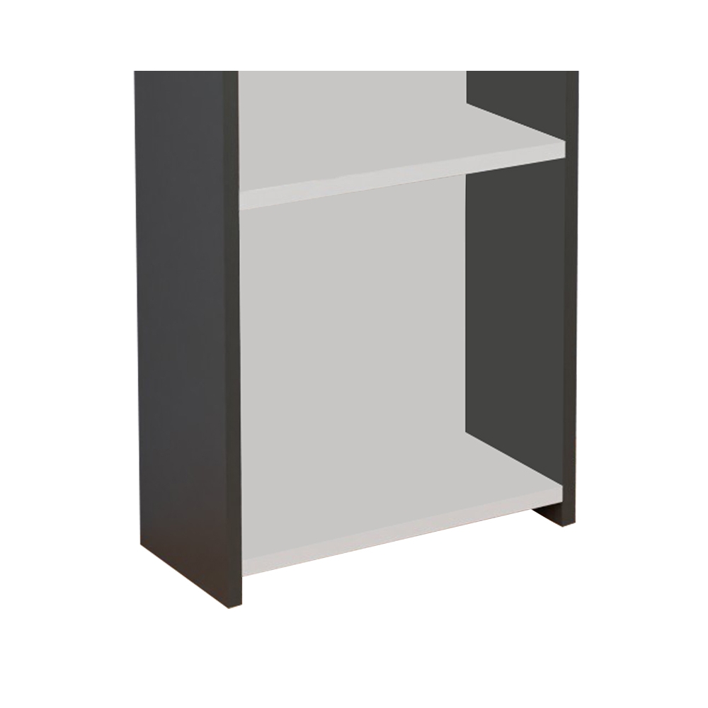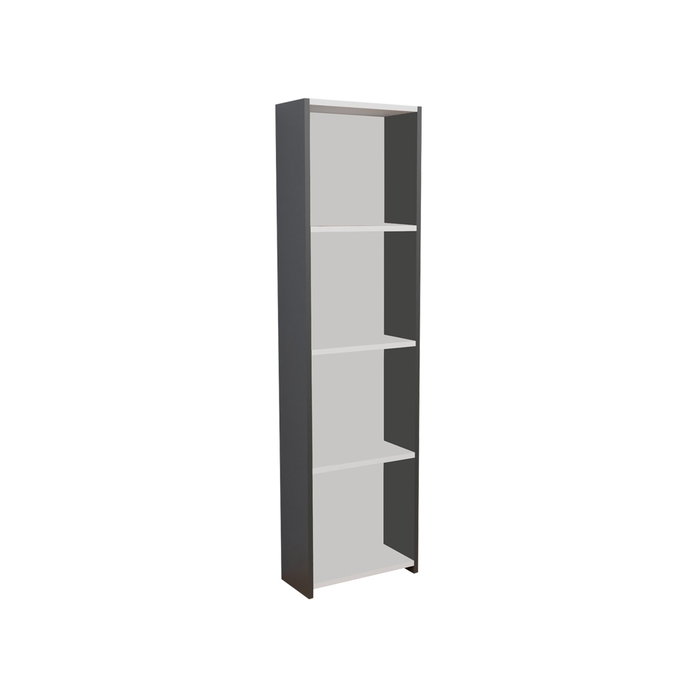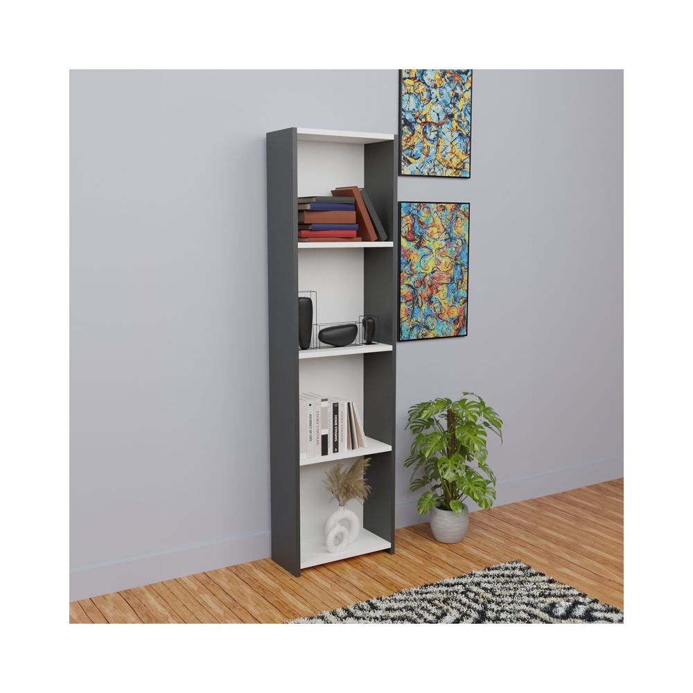Τεχνικά χαρακτηριστικά: * Φέρει ανθεκτικό σκελετό στήριξης από μοριοσανίδα μελαμίνης. Η μοριοσανίδα μελαμίνης είναι ένα είδος ξύλινου υλικού που αποτελείται από μικρά κομμάτια ξύλου που έχουν συνθετική επίστρωση με μελαμίνη. Το υλικό αυτό είναι γνωστό για την ανθεκτικότητα του και την εύκολη συντήρηση. Η επιφάνεια της μελαμίνης είναι λεία και ανθεκτική σε γρατζουνιές και χτυπήματα, κάνοντάς την κατάλληλη για καθημερινή χρήση. * Φέρει τέσσερα ράφια για την οργάνωση και αποθήκευση των βιβλίων και μικροαντικειμένων σας. * Προσφέρεται σε χρώμα ανθρακί-λευκό.