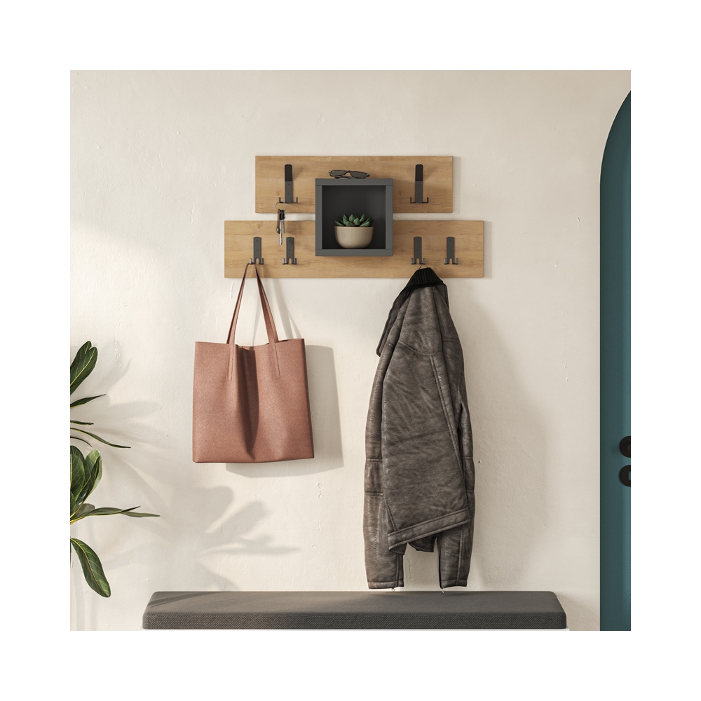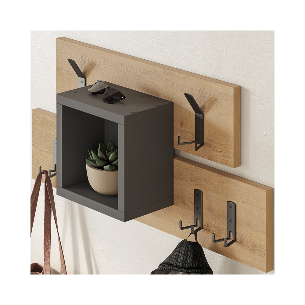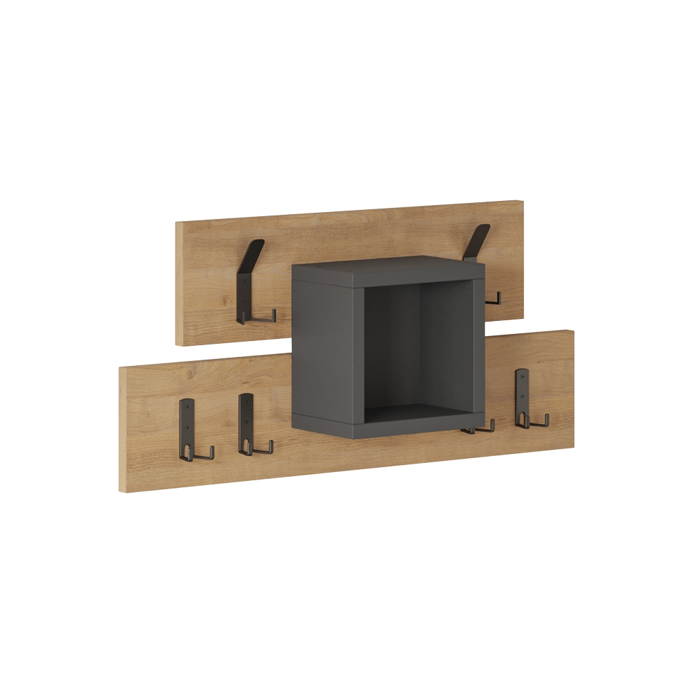 Τεχνικά χαρακτηριστικά: * Κατασκευασμένη από μοριοσανίδα με επένδυση μελαμίνης υψηλής ποιότητας, με αντοχή στην καταπόνηση και στον χρόνο. Η μοριοσανίδα μελαμίνης είναι ένα υλικό που χρησιμοποιείται ευρέως στην κατασκευή επίπλων και άλλων επιφανειών λόγω της ανθεκτικότητάς της και της εύκολης συντήρησής της. Είναι ένα υλικό που παράγεται από ξύλο που έχει συντηρηθεί και συνθλιβεί μαζί με συνθετικές ουσίες όπως η ρητίνη, υπό πίεση και θερμότητα. * Γατζάκια κατασκευασμένα από ενισχυμένο μέταλλο. * Προσφέρεται σε χρώμα oak-ανθρακί.