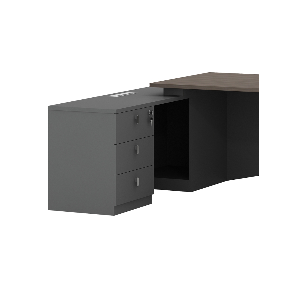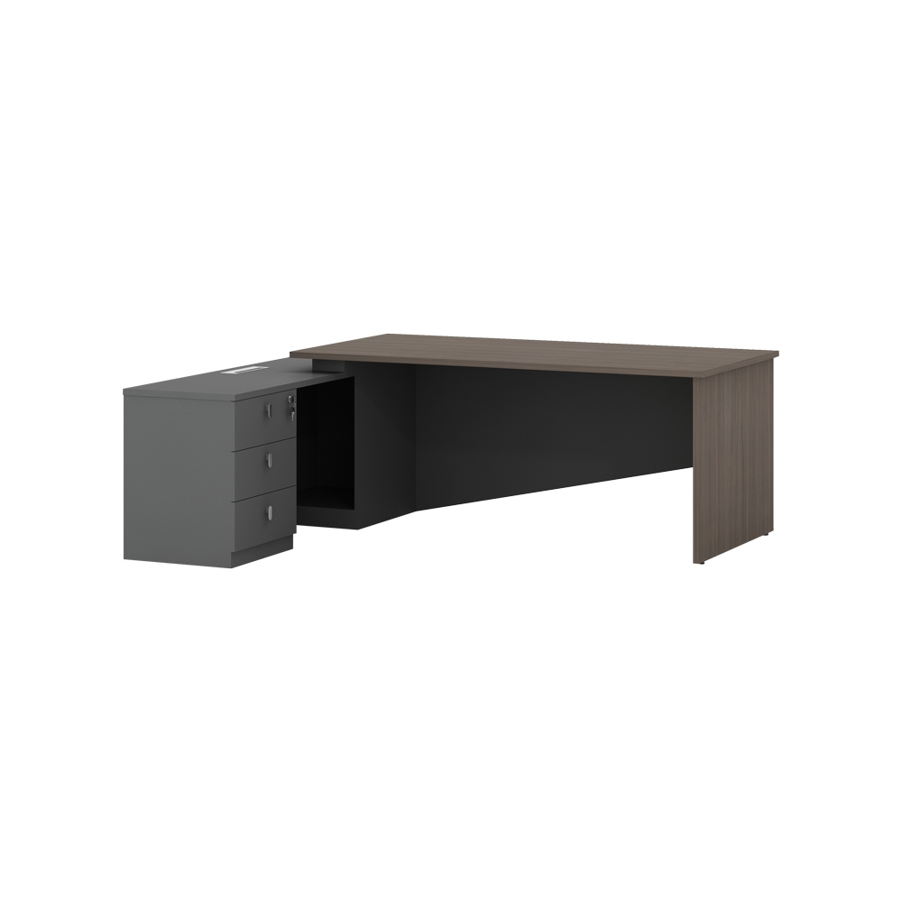 Γραφείο διεύθυνσης με ενσωματωμένο γωνιακό ερμάριο (στην αριστερή πλευρά), στον εντυπωσιακό χρωματισμό του καρυδί - ανθρακί. Κατασκευασμένο από υλικά υψηλών προδιαγραφών και σύμφωνα με τις εργονομικές απαιτήσεις του σήμερα.