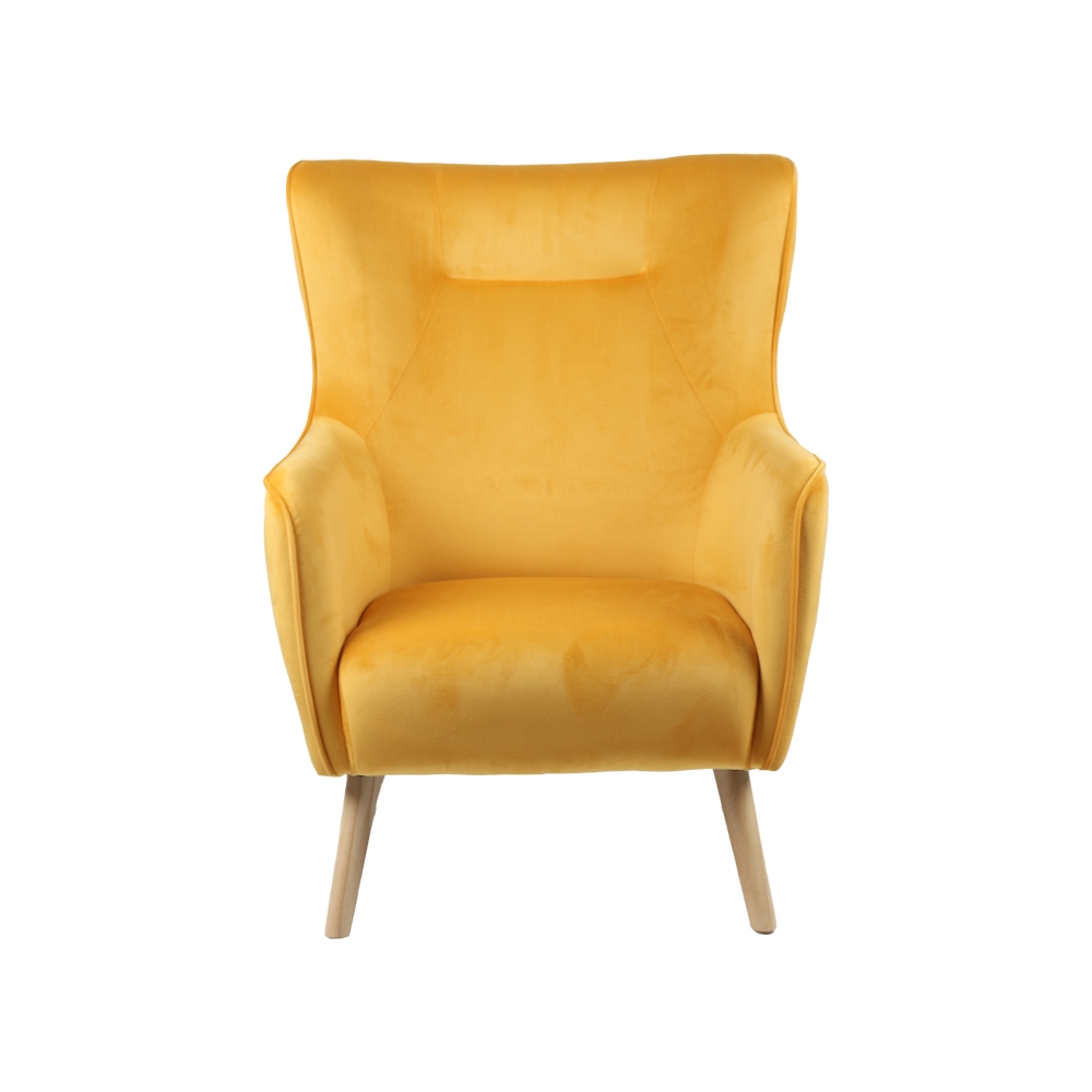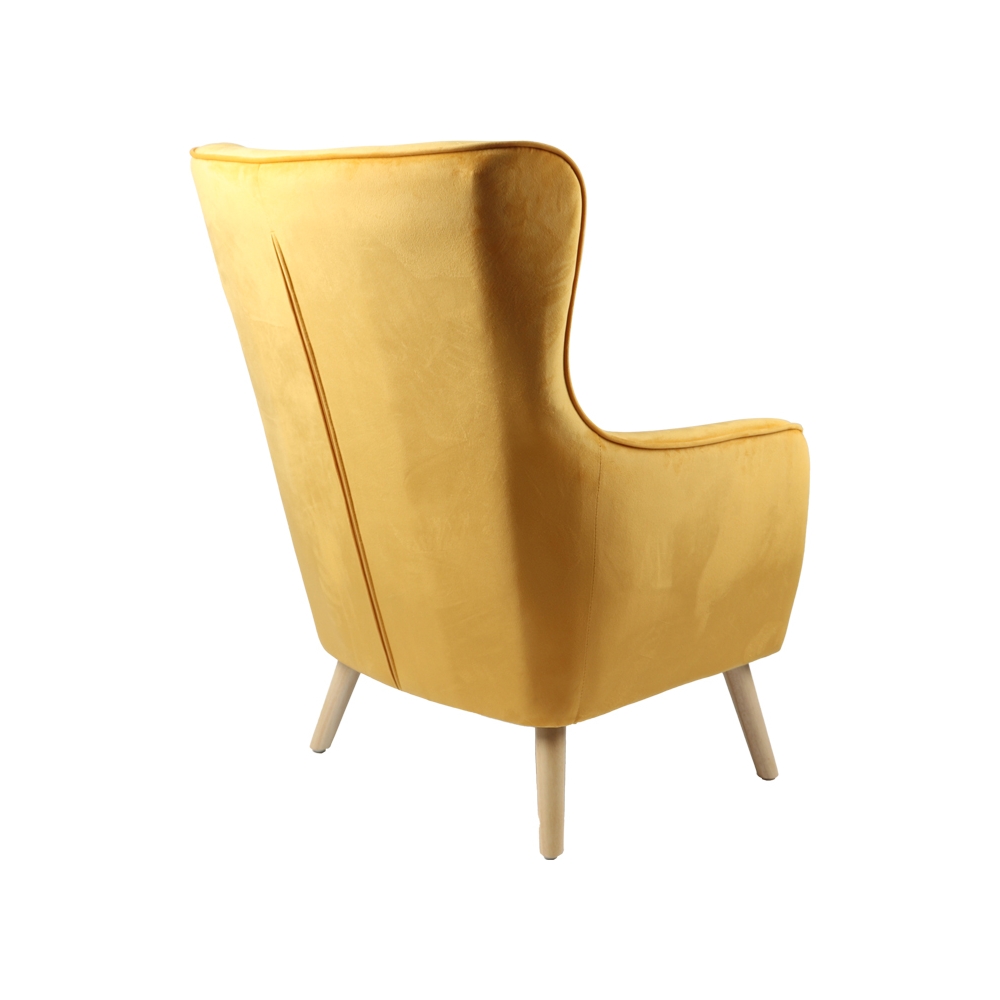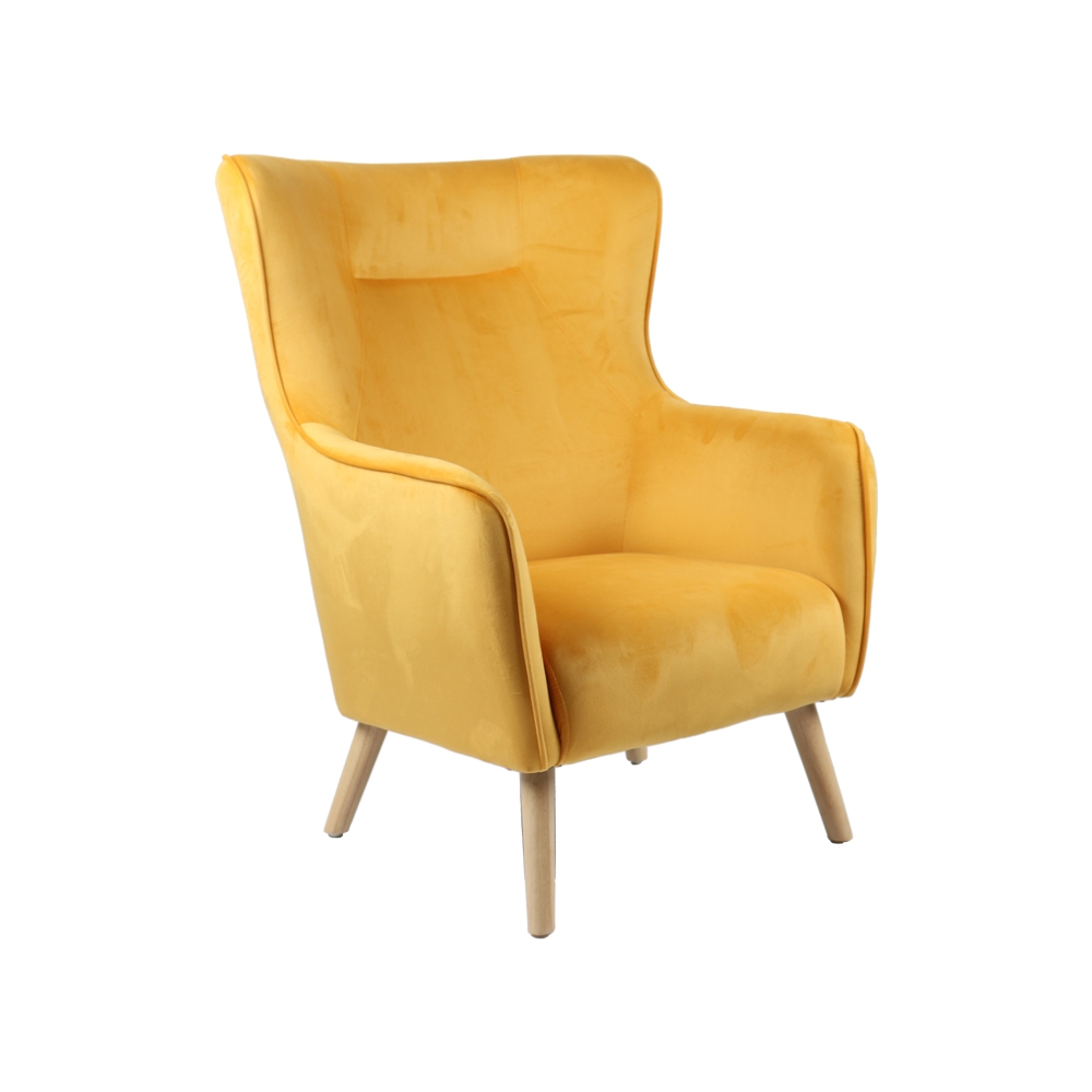 Τεχνικά χαρακτηριστικά: *Σκελετός κατασκευασμένος από ξύλο επενδεδυμένο με foam και ελατήρια για μεγαλύτερη ελαστικότητα, ανθεκτικότητα και αντοχή στον χρόνο. *Η ψηλή πλάτη αγκαλιάζει και ακολουθεί την σπονδυλική στήλη. *Επένδυση με μουσταρδί βελούδο ύφασμα υψηλής ποιότητας με μεγάλη αντοχή στη τριβή και στη φθορά. *Φέρει στήριξη σε τέσσερα ποδαράκια από ξύλο σε φυσική απόχρωση.