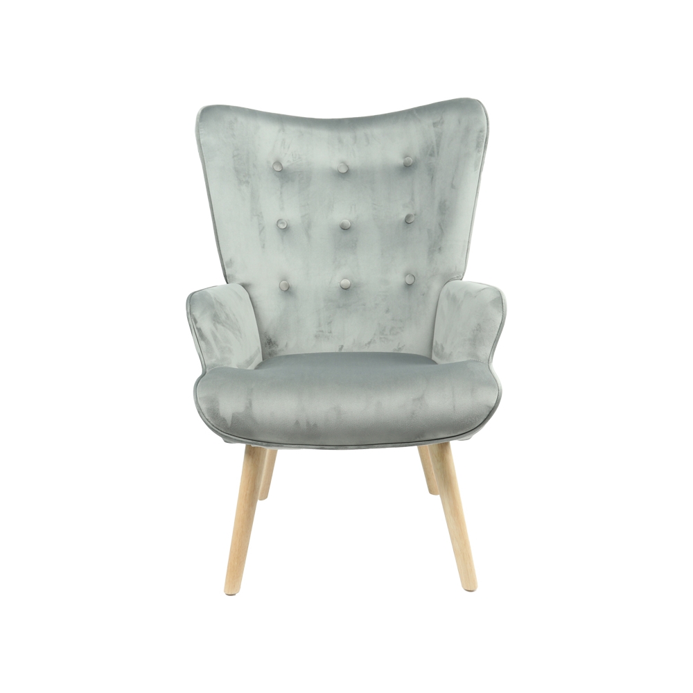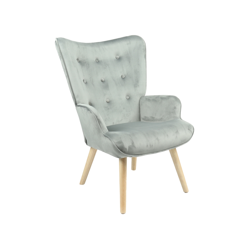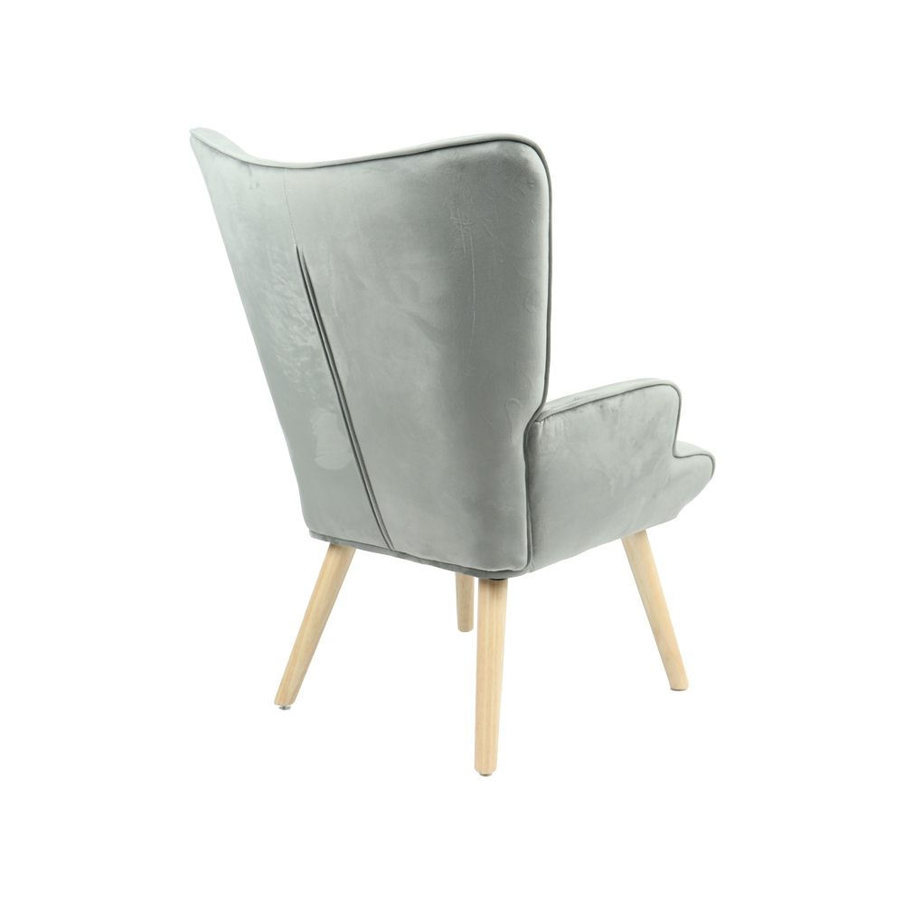 Τεχνικά χαρακτηριστικά: *Σκελετός κατασκευασμένος από ξύλο επενδεδυμένο με foam και ελατήρια για μεγαλύτερη ελαστικότητα, ανθεκτικότητα και αντοχή στον χρόνο. *Η ψηλή πλάτη αγκαλιάζει και ακολουθεί την σπονδυλική στήλη. *Επένδυση με γκρι βελούδο ύφασμα υψηλής ποιότητας με μεγάλη αντοχή στη τριβή και στη φθορά. *Φέρει στήριξη σε τέσσερα ποδαράκια από ξύλο σε φυσική απόχρωση.