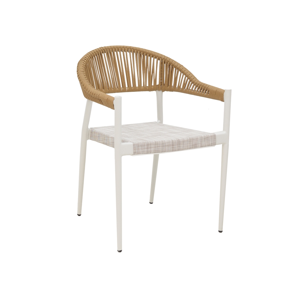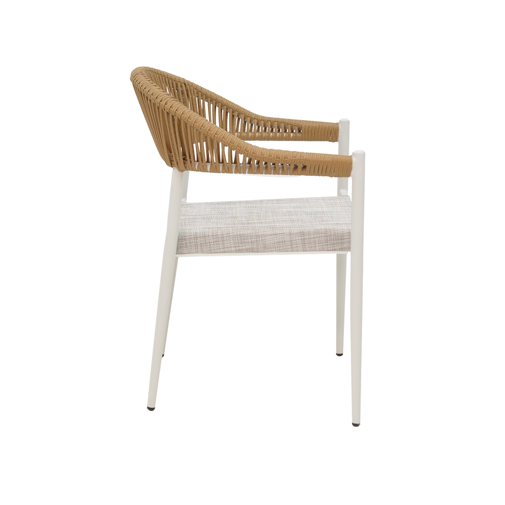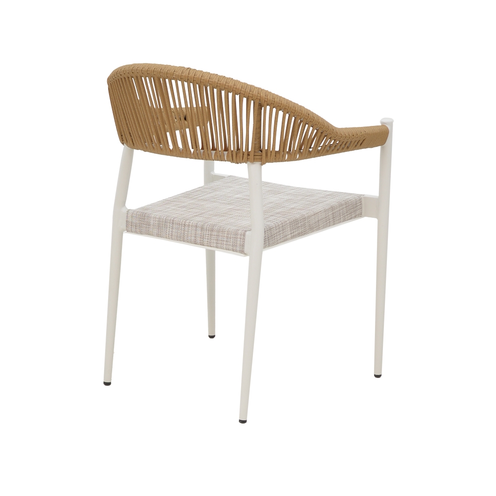 Τεχνικά χαρακτηριστικά: * Σταθερός σκελετός από εξαιρετικής ποιότητας αλουμίνιο με αντοχή στην καταπόνηση και στη φθορά. * Κυρίως σώμα καρέκλας από εξαιρετικής ποιότητας mesh ύφασμα και ρατάν. Η κύρια ιδιότητα του ράταν είναι η ευελιξία του, καθώς μπορεί να πλεκτεί και να διαμορφωθεί εύκολα. Επίσης, είναι ανθεκτικό και αντέχει στις καιρικές συνθήκες, καθιστώντας το ιδανικό για επιπλέον εξωτερικούς χώρους. Το ύφασμα mesh είναι ένας τύπος υφάσματος που χαρακτηρίζεται από την άνοιγμά του, δηλαδή την ύπαρξη μικρών οπών ή δικτυών που επιτρέπουν τη διέλευση αέρα και φωτός. * Το αλουμίνιο δημιουργεί ένα προστατευτικό οξειδωτικό στρώμα όταν έρχεται σε επαφή με τον αέρα, προστατεύοντας από τη διάβρωση, ενώ παράλληλα είναι πλήρως ανακυκλώσιμο χωρίς να χάσει τις ιδιότητές του, κάνοντάς το ένα πολύ βιώσιμο υλικό. * Έδρα κατασκευασμένη από textilene. Το textilene είναι ένα εξαιρετικά ανθεκτικό υλικό που χρησιμοποιείται ευρέως σε επίπλωση εξωτερικών χώρων και εξαρτήματα. Αποτελείται από πολυεστερικές ινώδεις που επικαλύπτονται με PVC (πολυβινυλοχλωρίδιο), δημιουργώντας ένα υλικό που συνδυάζει ανθεκτικότητα, αντοχή στις καιρικές συνθήκες και εύκαμπτη υφή. Το υλικό αυτό επιτρέπει τη διέλευση του αέρα, βοηθώντας στη διατήρηση μιας δροσερής αίσθησης κατά τη χρήση. * Oι καταλήξεις των ποδιών φέρουν προστατευτικά καλύμματα. * Προσφέρεται σε χρώμα φυσικό-λευκό.