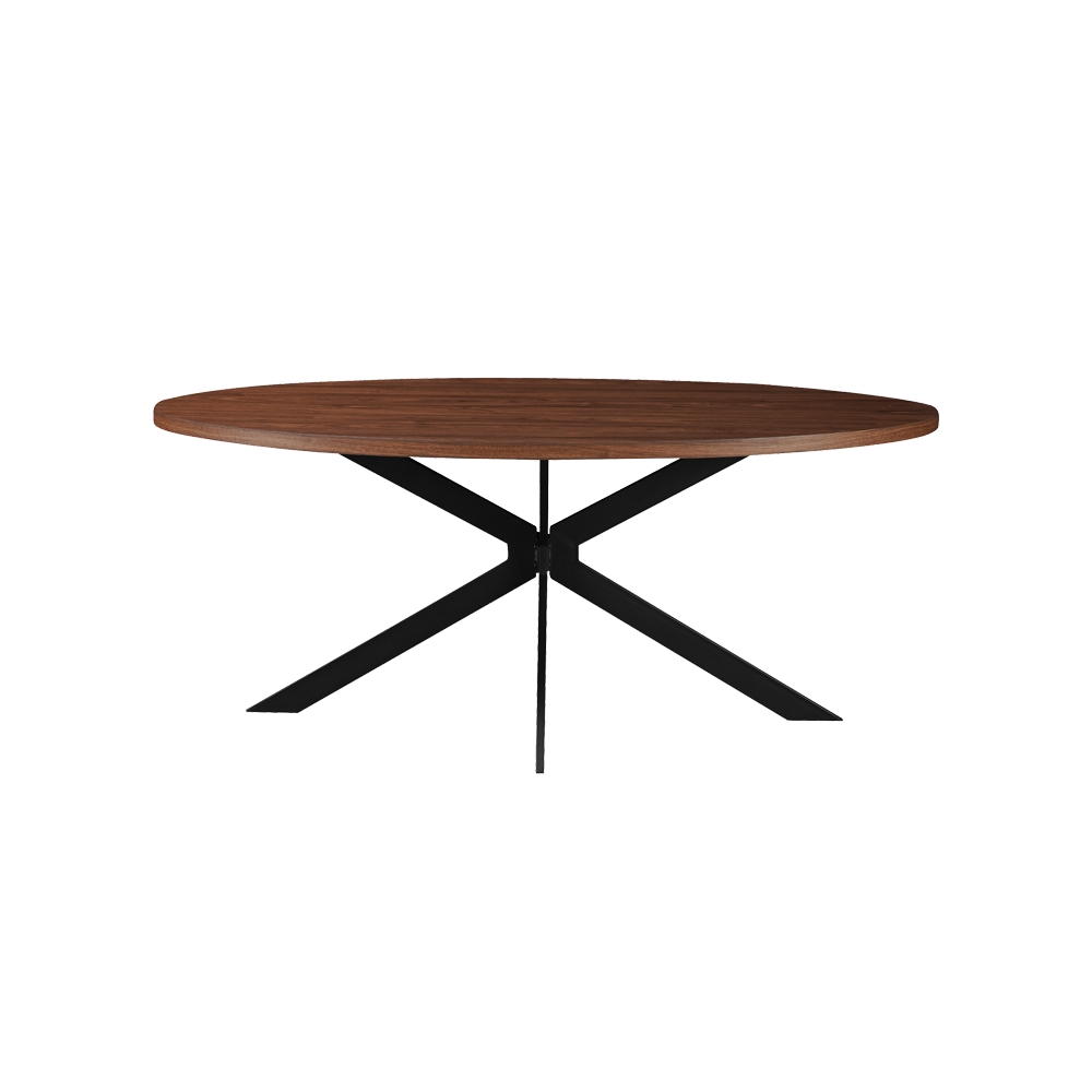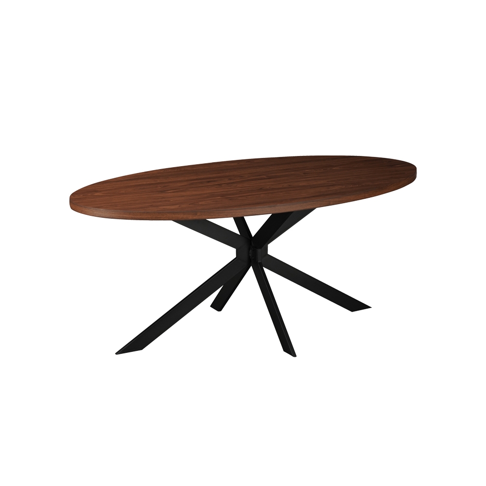 Τεχνικά χαρακτηριστικά: * Η επιφάνεια κατασκευάζεται από MDF ξύλο ψηλής ποιότητας με αντοχή στην καταπόνηση και στον χρόνο - σε καρυδί χρωματισμό. Το MDF (Medium-density fibreboard/ινοσανίδα) είναι παράγωγο ξύλου. Για την παραγωγή του χρησιμοποιούνται ρητίνες (κόλλες) για την συγκόληση των ινών ξύλου οι οποίες συμπιέζονται με ειδικές θερμαινόμενες πρέσες. Είναι πιο πυκνό από την μοριοσανίδα (chipboard) και ανθεκτικό σε αντοχή. Επίσης, δεν απορροφά καθόλου υγρασία. * Οβάλ σχήμα που απογειώνει το αισθητικό αποτέλεσμα. * Βάση στήριξης: Τέσσερα μεταλλικά πόδια, βαμμένα σε μαύρο χρώμα.