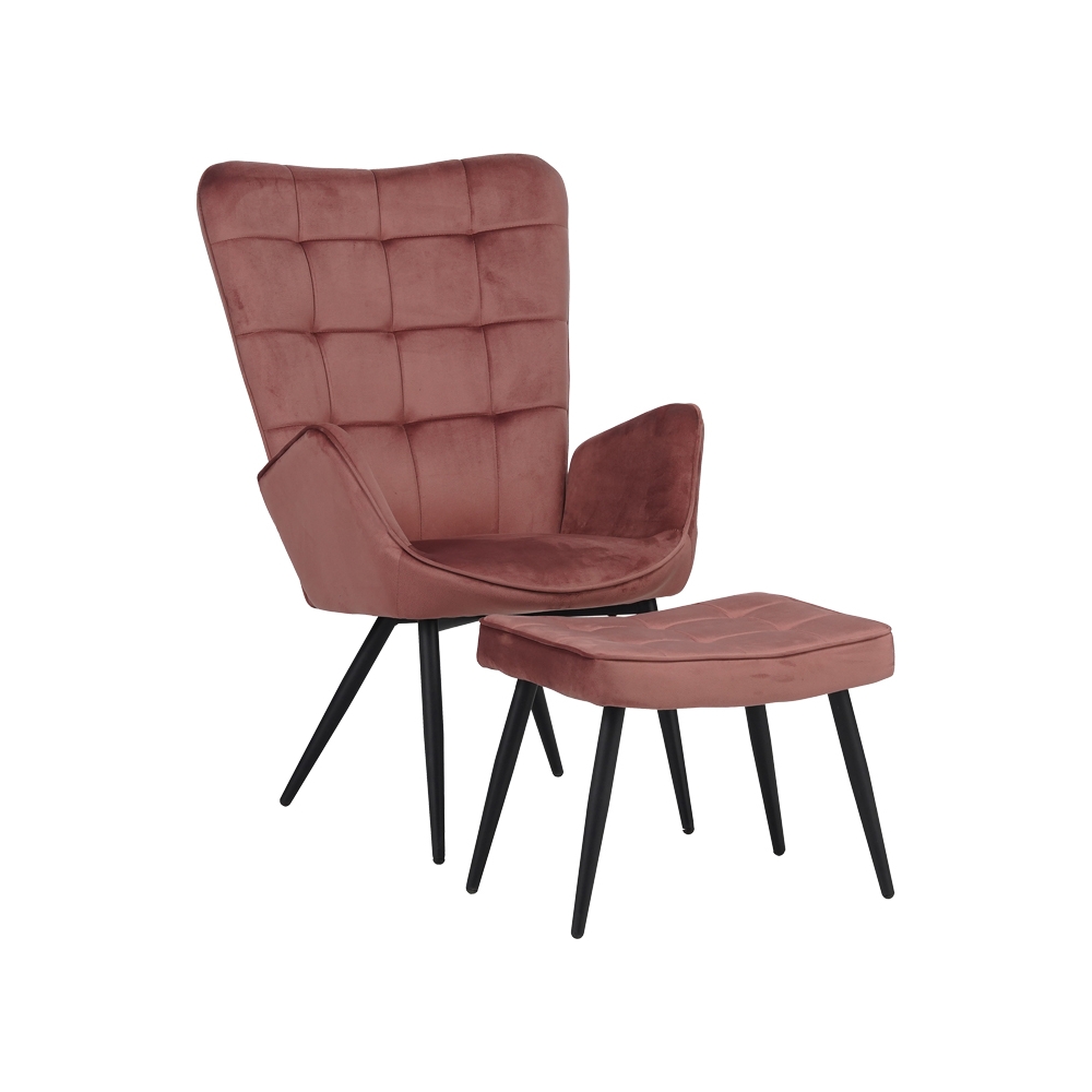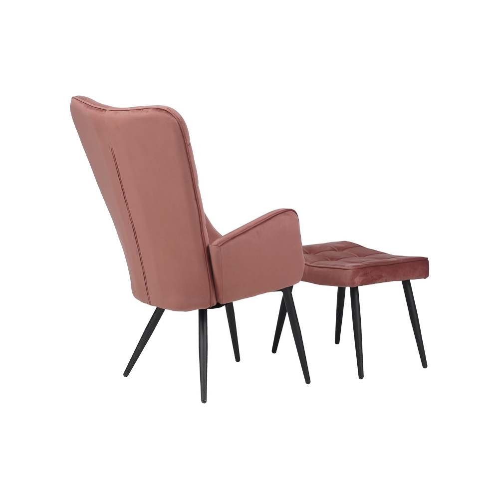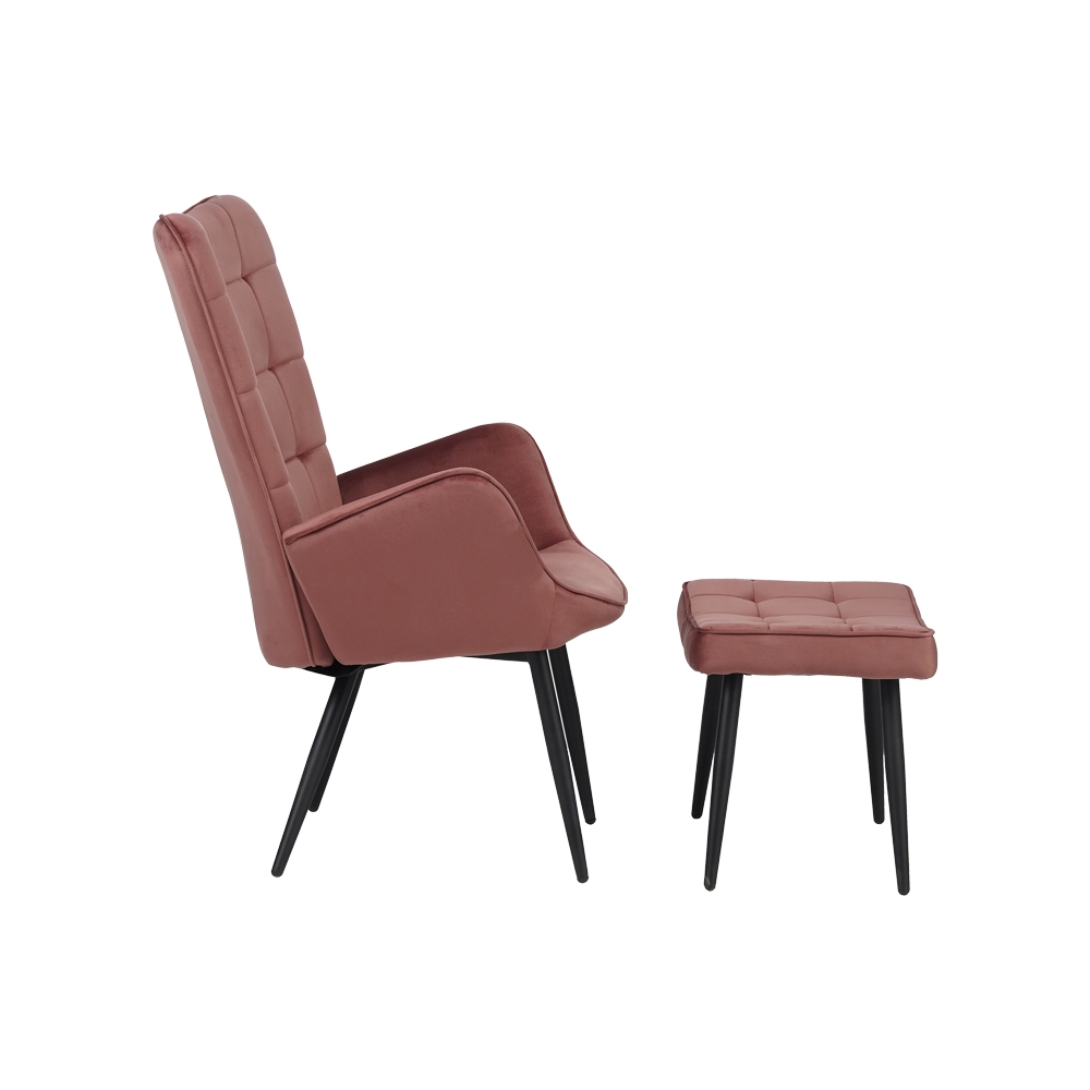Τεχνικά χαρακτηριστικά: *Πλάτη και έδρα κατασκευασμένες από ενισχυμένο ξύλινο σκελετό με μεγάλη ανθεκτικότητα και αντοχές στη φθορά. *Η ψηλή πλάτη αγκαλιάζει και ακολουθεί την σπονδυλική στήλη στηρίζοντας τη μέση. Έχει μοντέρνο καμπύλο σχεδιασμό και σχέδιο με διακοσμητικούς καμπαράδες. *Φέρνει ενσωματωμένο μπράτσο για την χαλάρωση των χεριών του χρήστη *Στήριξη σε μεταλλική βάση που καταλήγει σε τέσσερα ενισχυμένα πόδια, εξαιρετικής ποιότητας και με αντοχή στο βάρος και στο χρόνο. *Επένδυση με βελούδο ασυναγώνιστης ποιότητας με αντοχή στη φθορά και στις τριβές. * Προσφέρεται σε χρώμα σάπιο μήλο. *Οι καταλήξεις των ποδιών διαθέτουν προστατευτικά πλαστικά καλύμματα για την προστασία του πατώματος από ανεπιθύμητες φθορές. *Επιπλέον φέρει υποπόδιο/σκαμπό καθώς και μαξιλαράκι.