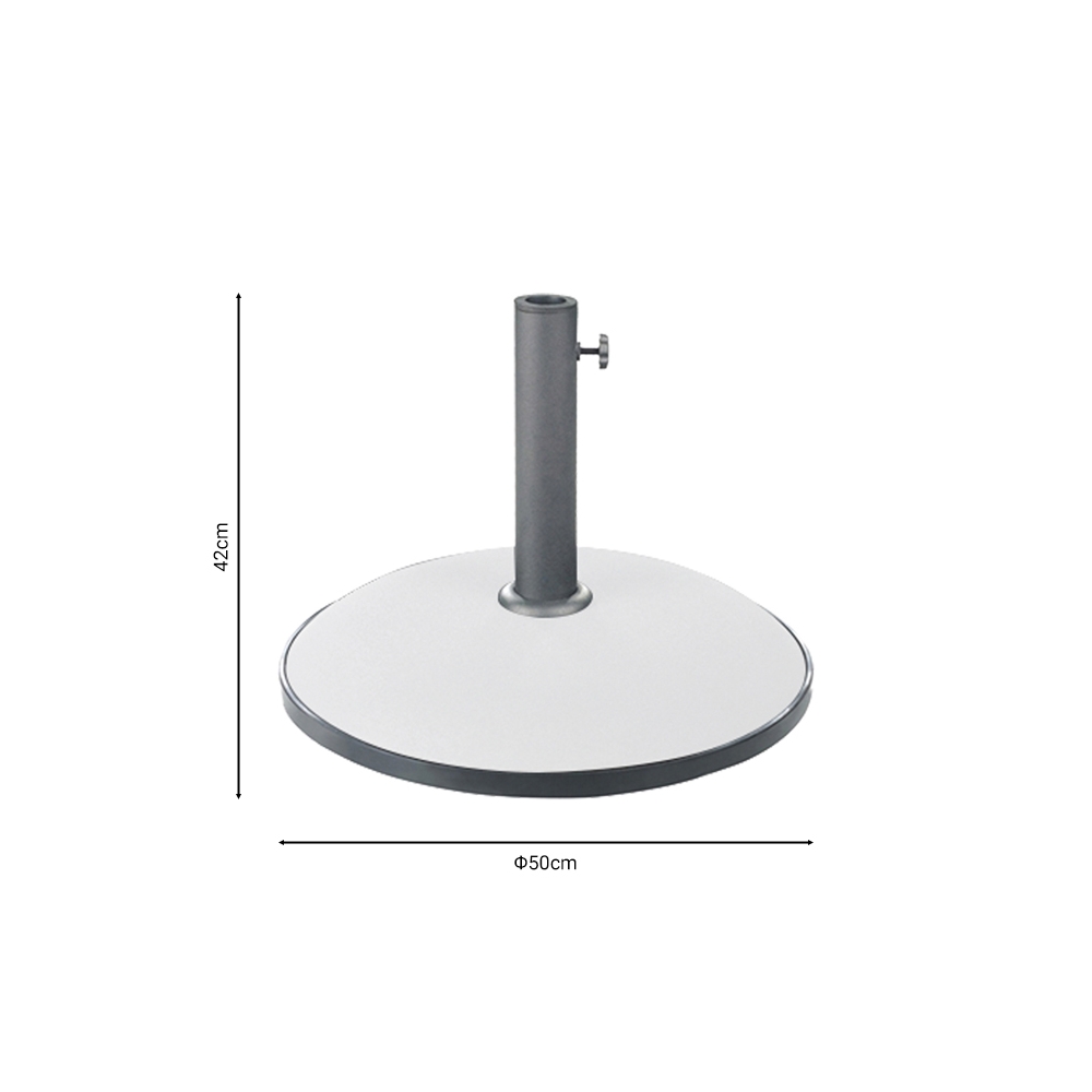 Τεχνικά χαρακτηριστικά: * Κατασκευή από τσιμέντο εξαιρετικής ποιότητας με μεγάλη αντοχή σε βάρος, χρήση και φθορά. Η βάση από τσιμέντο προσφέρει σταθερότητα και ασφάλεια, κρατώντας την ομπρέλα σταθερή ακόμα και σε ανεπίφορες καιρικές συνθήκες. Είναι μια πρακτική και αξιόπιστη επιλογή για τη δημιουργία ενός άνετου και λειτουργικού εξωτερικού χώρου. * Προσφέρεται σε χρώμα λευκό. * Διάμετρος σωλήνα: 5.8εκ * Διάμετρος θέσεων σωλήνα: 4.8εκ - 3.8εκ - 3.5εκ * Βάρος προϊόντος 35kg. * Διάμετρος άξονα ομπρέλας: 50εκ