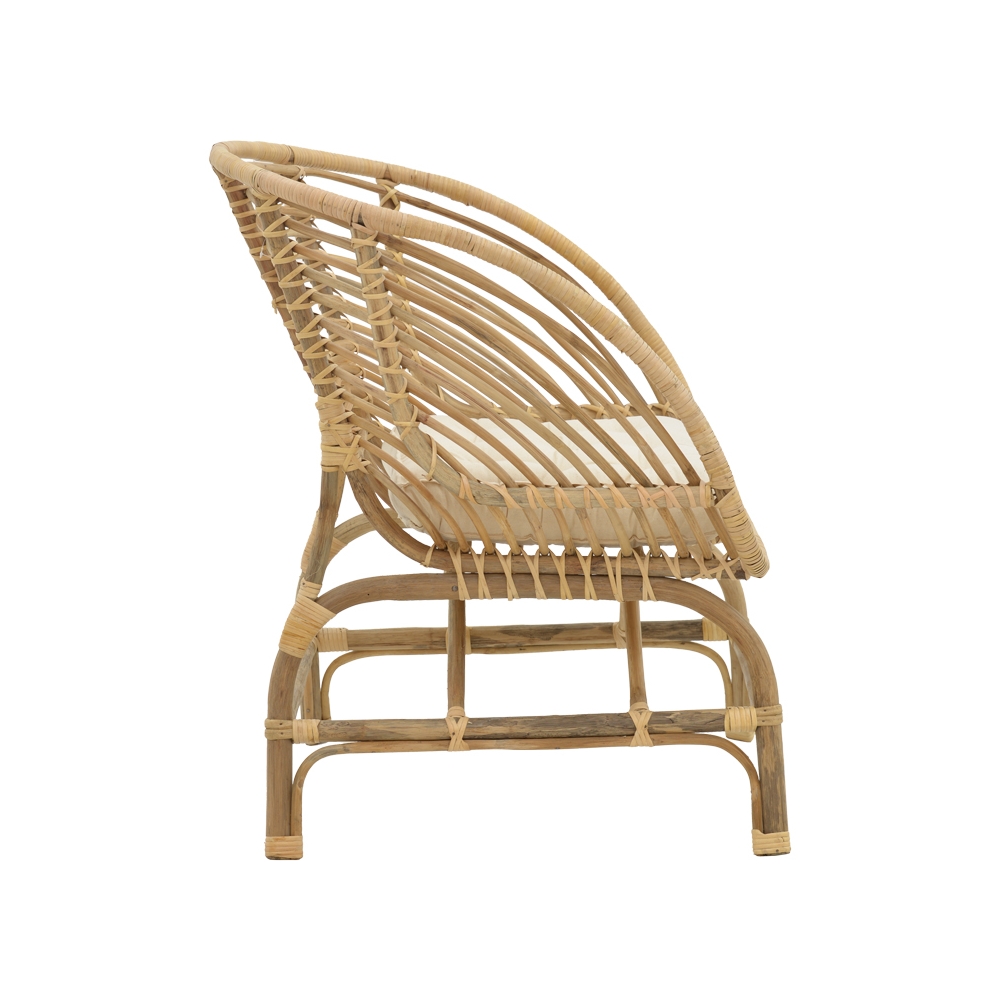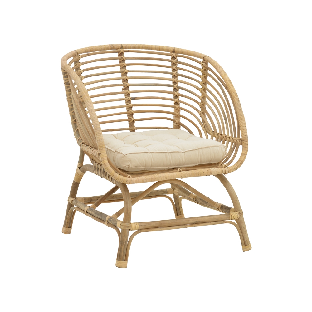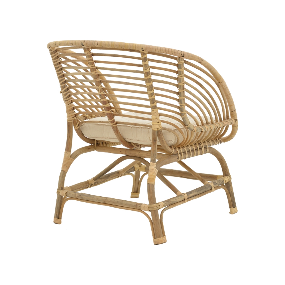 Τεχνικά χαρακτηριστικά: * Κατασκευή από cane εξαιρετικής ποιότητας με μεγάλη αντοχή σε φθορά, χρόνο και χρήση. Tο "cane" αναφέρεται συνήθως στο υλικό που προέρχεται από το φυτό "rattan" (ρατάν), το οποίο είναι ένας τύπος φυτού που ανήκει στην οικογένεια των palm. Το ρατάν είναι γνωστό για την ευκαμψία και την ανθεκτικότητά του και χρησιμοποιείται ευρέως στην κατασκευή επίπλων και διακοσμητικών αντικειμένων. Το cane είναι ελαφρύ, ανθεκτικό και ευέλικτο, κάνοντάς το κατάλληλο για διάφορες εφαρμογές. Επίσης, προσφέρει μια φυσική και οργανική αισθητική σε κάθε προϊόν που κατασκευάζεται με αυτό. Είναι δημοφιλές λόγω της φυσικής του εμφάνισης και της δυνατότητάς του να προσθέσει έναν αέρα φυσικής γοητείας στον χώρο. * Περιλαμβάνει μαξιλάρι για ακόμη πιο άνετο κάθισμα. * Προσφέρεται σε χρώμα φυσικό.