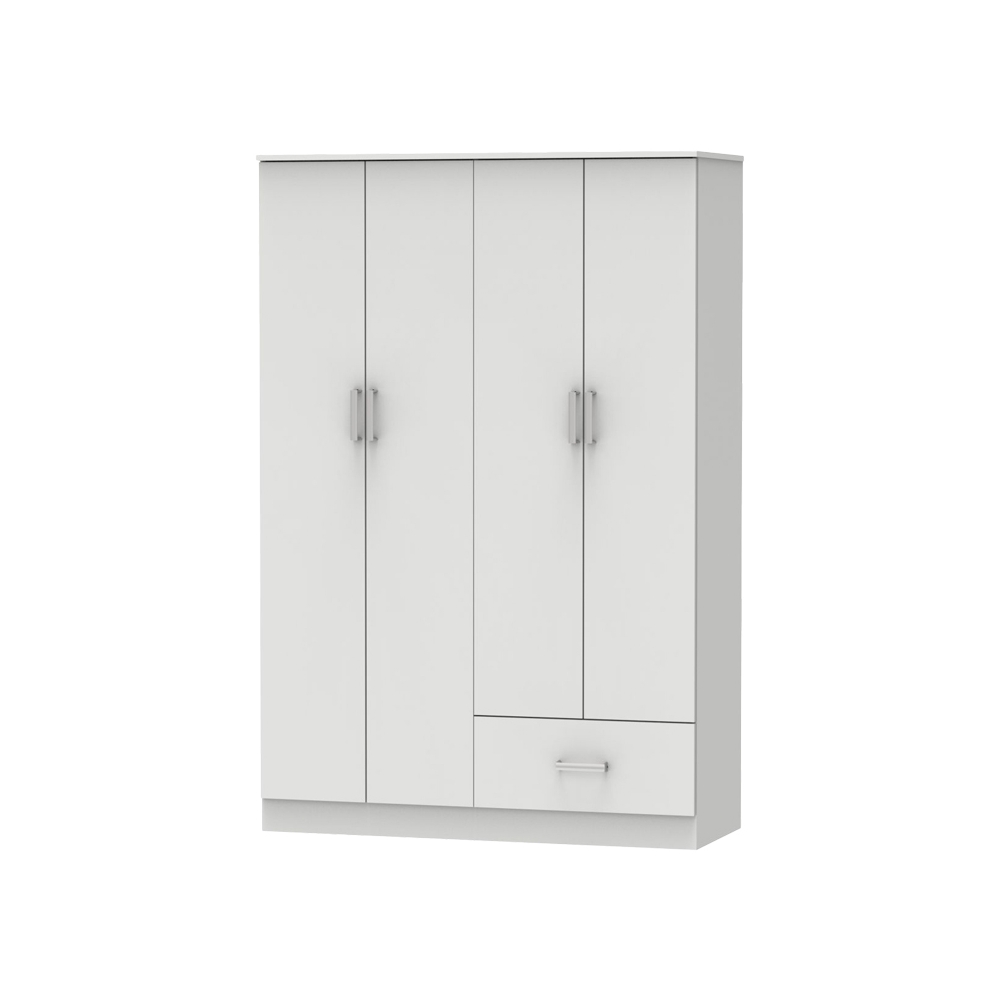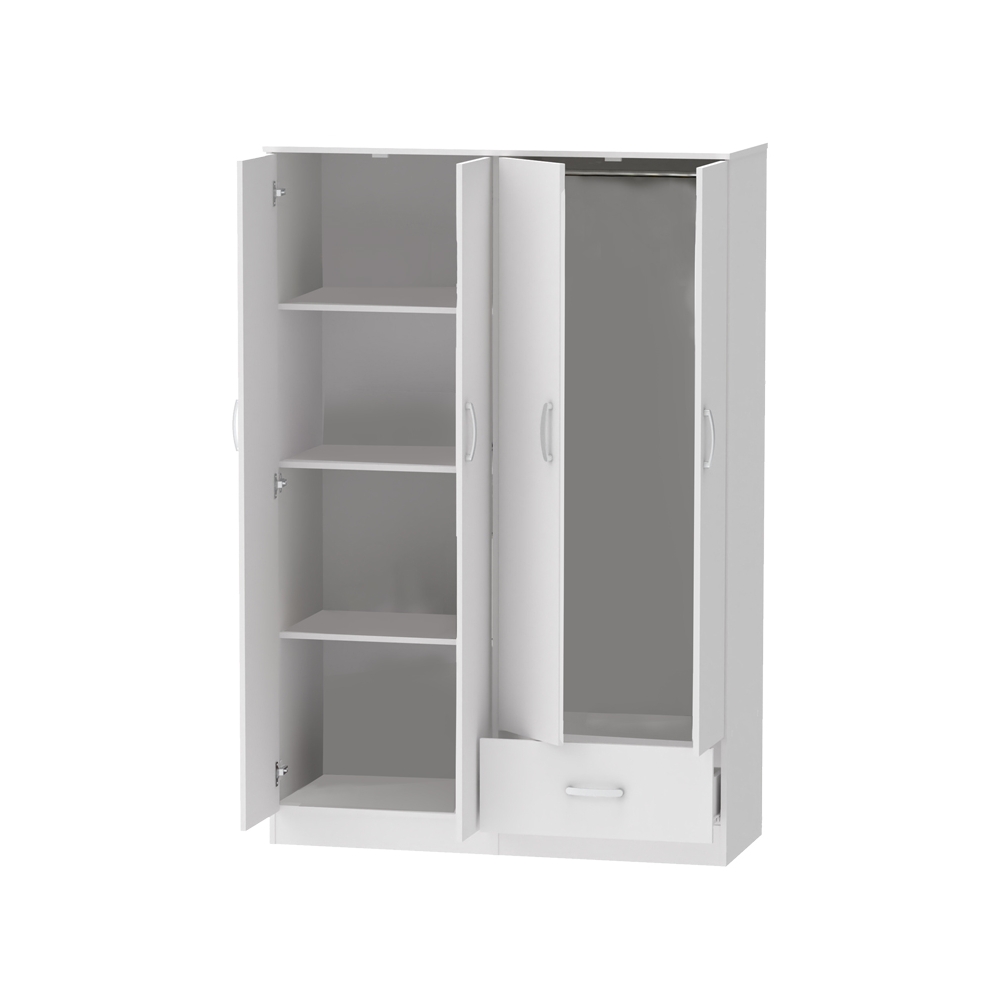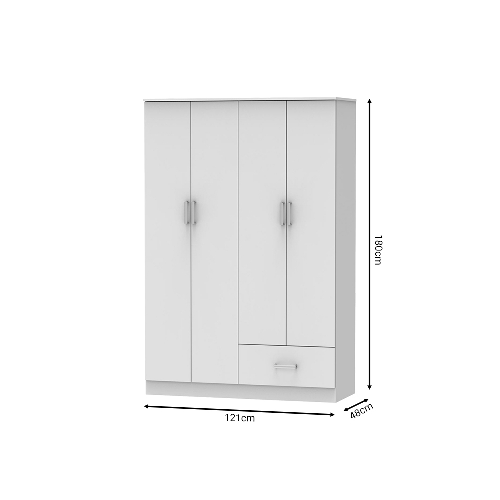 Τεχνικά χαρακτηριστικά: * Σκελετός κατασκευασμένος από μοριοσανίδα με επένδυση paper wood υψηλής ποιότητας, με αντοχή στην καταπόνηση, την φθορά και τον χρόνο. Η μοριοσανίδα, γνωστή ως chipboard, είναι ένα σύνθετο ξύλινο υλικό που κατασκευάζεται από μικρά κομματάκια ξύλου, συνήθως πεύκου ή ελάτης, κολλημένα μαζί υπό υψηλή πίεση και θερμοκρασία με τη χρήση ρητινών. Χρησιμοποιείται ευρέως στην κατασκευή επίπλων, εσωτερικών επιφανειών και δομικών εφαρμογών. Κατασκευάζεται από ανακυκλωμένα υλικά και είναι ανθεκτική σε καμπύλες, τριβές και άλλες φυσικές καταπονήσεις. * Προσφέρεται σε χρώμα λευκό. * Περιλαμβάνει τέσσερις πόρτες για αποθήκευση. Οι δύο πόρτες δεξιά, στο εσωτερικό τους διαθέτουν ράγα για κρεμάστρες.Οι δύο μεγαλύτερες πόρτες διαθέτουν στο εσωτερικό τους τέσσερα ράφια. Στο κάτω μέρος φέρει ένα συρόμενο συρτάρι για την αποθήκευση ρούχων και αξεσουάρ. * Ο χρωματικός συνδυασμός και η λεπτομέρεια του μεταλλικού χρώματος στα πόμολα απογειώνει το τελικό αισθητικό αποτέλεσμα.