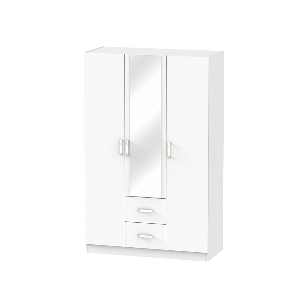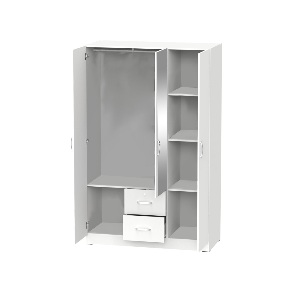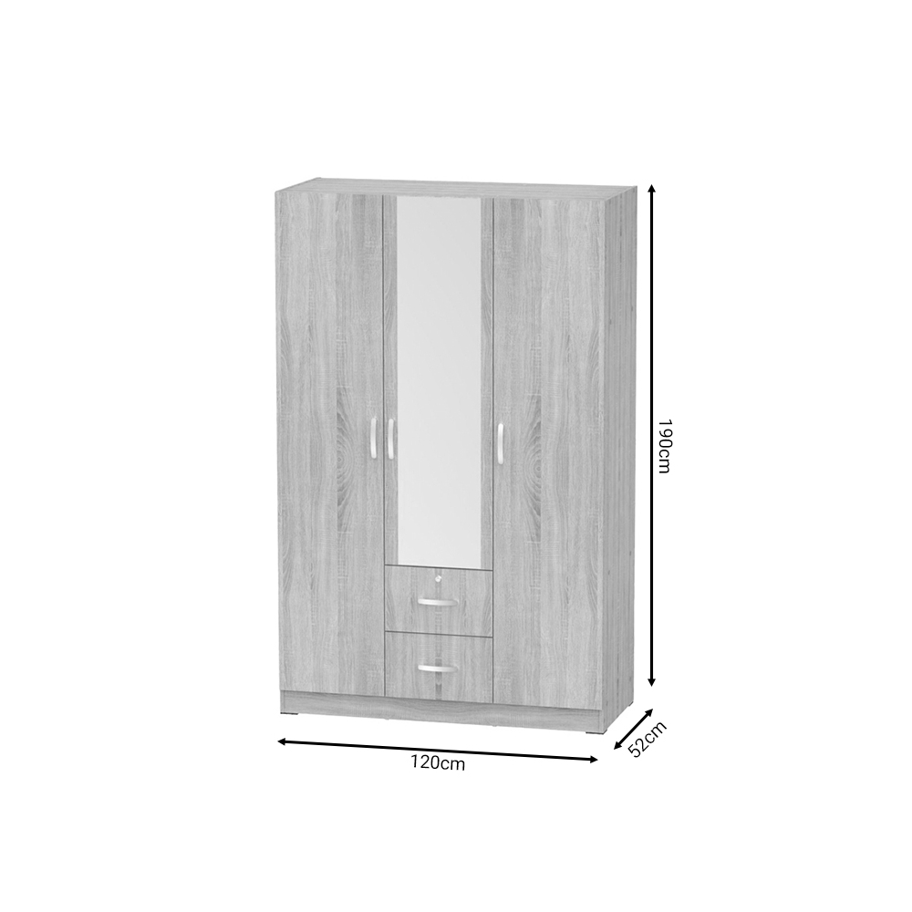 Τεχνικά χαρακτηριστικά: * Σκελετός κατασκευασμένος από μοριοσανίδα με επένδυση paper wood υψηλής ποιότητας, με αντοχή στην καταπόνηση, την φθορά και τον χρόνο. Η μοριοσανίδα, γνωστή ως chipboard, είναι ένα σύνθετο ξύλινο υλικό που κατασκευάζεται από μικρά κομματάκια ξύλου, συνήθως πεύκου ή ελάτης, κολλημένα μαζί υπό υψηλή πίεση και θερμοκρασία με τη χρήση ρητινών. Χρησιμοποιείται ευρέως στην κατασκευή επίπλων, εσωτερικών επιφανειών και δομικών εφαρμογών. Κατασκευάζεται από ανακυκλωμένα υλικά και είναι ανθεκτική σε καμπύλες, τριβές και άλλες φυσικές καταπονήσεις. * Προσφέρεται σε χρώμα λευκό. * Περιλαμβάνει τρεις πόρτες για αποθήκευση. Οι δύο πόρτες αριστερά, στο εσωτερικό τους διαθέτους ράγα για κρεμάστρες. Η μονή πόρτα διαθέτει στο εσωτερικό της τέσσερα ράφια. Στο κάτω μέρος φέρει δύο συρτάρια για την αποθήκευση ρούχων και αξεσουάρ. * Ο χρωματικός συνδυασμός και η λεπτομέρεια του μεταλλικού χρώματος στα πόμολα απογειώνει το τελικό αισθητικό αποτέλεσμα.