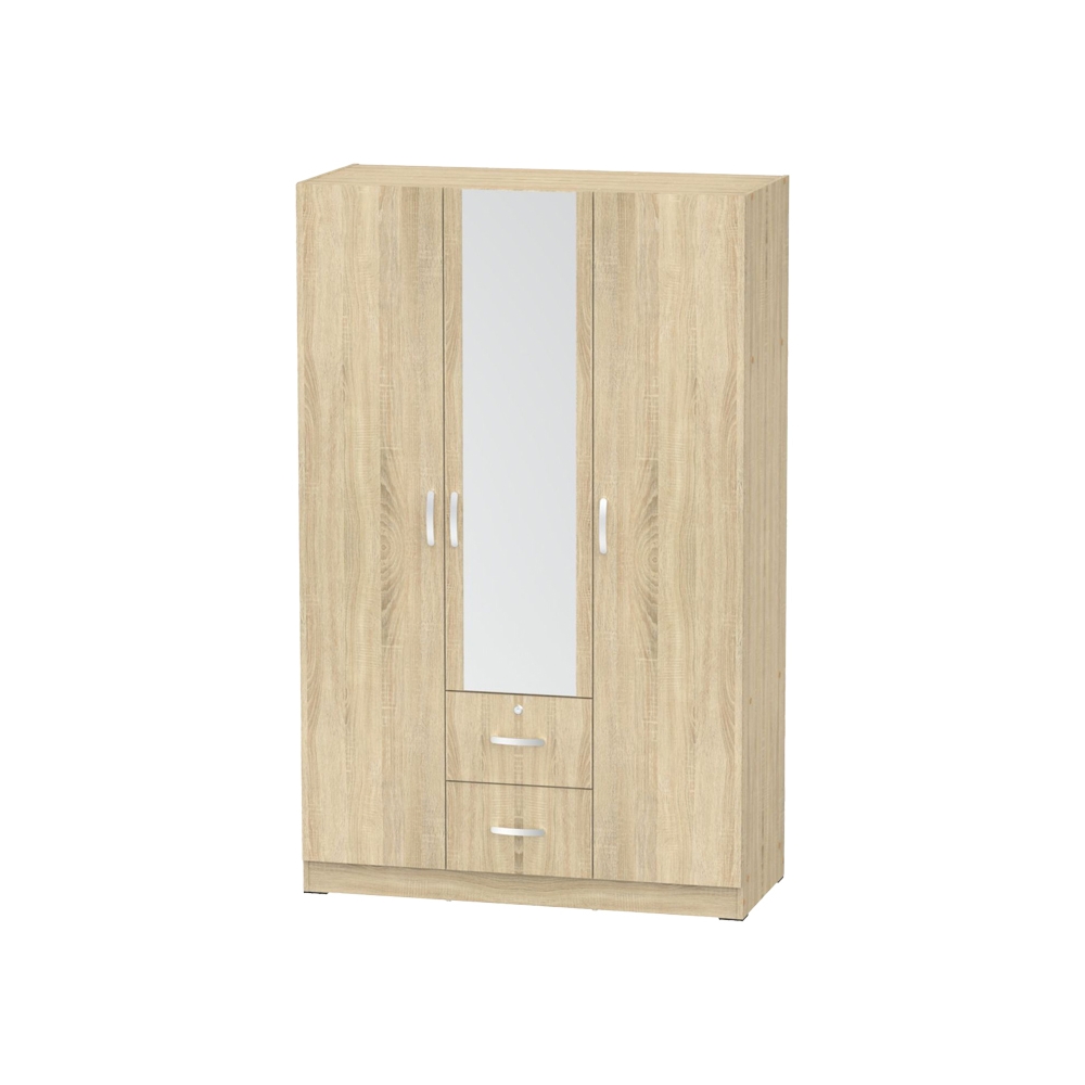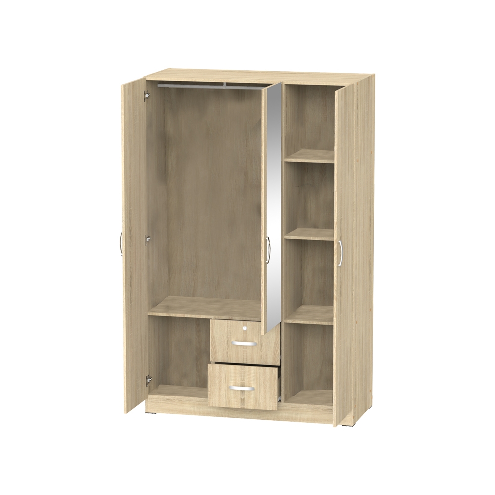 Τεχνικά χαρακτηριστικά: * Σκελετός κατασκευασμένος από μοριοσανίδα με επένδυση paper wood υψηλής ποιότητας, με αντοχή στην καταπόνηση, την φθορά και τον χρόνο. Η μοριοσανίδα, γνωστή ως chipboard, είναι ένα σύνθετο ξύλινο υλικό που κατασκευάζεται από μικρά κομματάκια ξύλου, συνήθως πεύκου ή ελάτης, κολλημένα μαζί υπό υψηλή πίεση και θερμοκρασία με τη χρήση ρητινών. Χρησιμοποιείται ευρέως στην κατασκευή επίπλων, εσωτερικών επιφανειών και δομικών εφαρμογών. Κατασκευάζεται από ανακυκλωμένα υλικά και είναι ανθεκτική σε καμπύλες, τριβές και άλλες φυσικές καταπονήσεις. * Προσφέρεται σε χρώμα sonoma. * Περιλαμβάνει τρεις πόρτες για αποθήκευση. Οι δύο πόρτες αριστερά, στο εσωτερικό τους διαθέτους ράγα για κρεμάστρες. Η μονή πόρτα διαθέτει στο εσωτερικό της τέσσερα ράφια. Στο κάτω μέρος φέρει δύο συρτάρια για την αποθήκευση ρούχων και αξεσουάρ. * Ο χρωματικός συνδυασμός και η λεπτομέρεια του μεταλλικού χρώματος στα πόμολα απογειώνει το τελικό αισθητικό αποτέλεσμα.